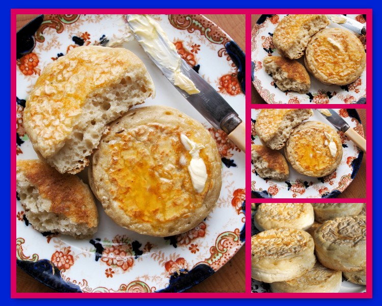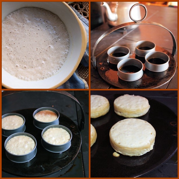 These look really lovely. I make crumpets but I don’t possess crumpet rings. The urge to make them was so great that I couldn’t wait until I’d been shopping. I took the top and bottom off several tuna cans waiting to go in the recycling and that worked just as well.