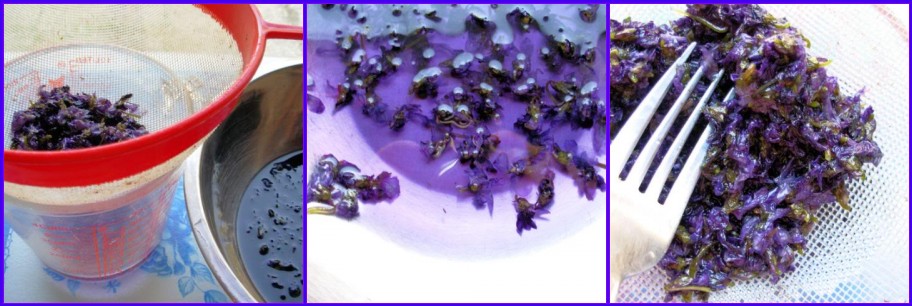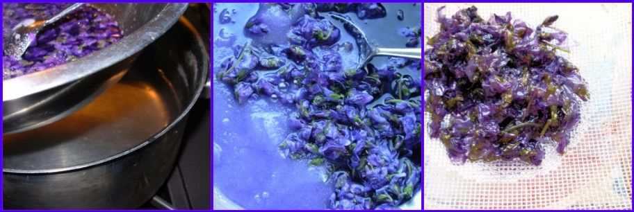 “Remove all of the stalks, green “peeps” in the middle of the violets and the leaves before putting all of the the flowers into a clean bowl, such as a Mason’s mixing bowl or a stainless steel bowl. Pour the boiling water over the flowers, then cover with a tea towel and allow the violets to infuse overnight or for 24 hours”