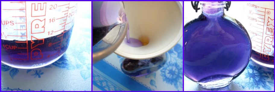 Step 4 | Strain the violet mixture through a fine sieve, then bottle and label the syrup and keep in a cool place, or the fridge for up to 12 months. Use in cakes, scones, pancakes, icings, butter creams, ice creams, biscuits, beverages, cream puddings, custards, cakes etc. |