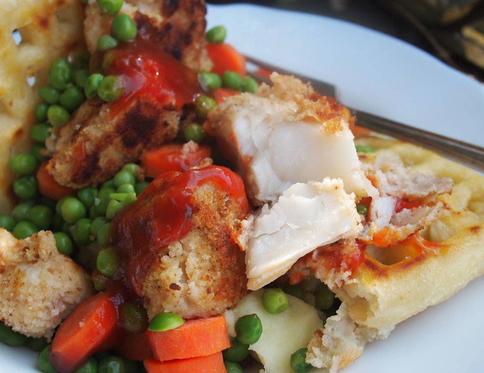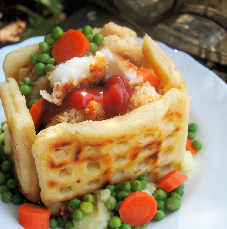Now, there are no small children in my household nowadays, but, we all still enjoyed this dish the other day, and why not? Wonderful wild Scottish coley fillets, that are cut into small nuggets and then pan-fried until crisp and golden – then served inside a little treasure trove chest of potato waffles and topped up with peas, carrots and a little mashed potato………a fun way to serve fish to small fry as well as the big fry! This is a wonderful way to get children to eat fish, as well as vegetables, and makes fishy Friday fun!