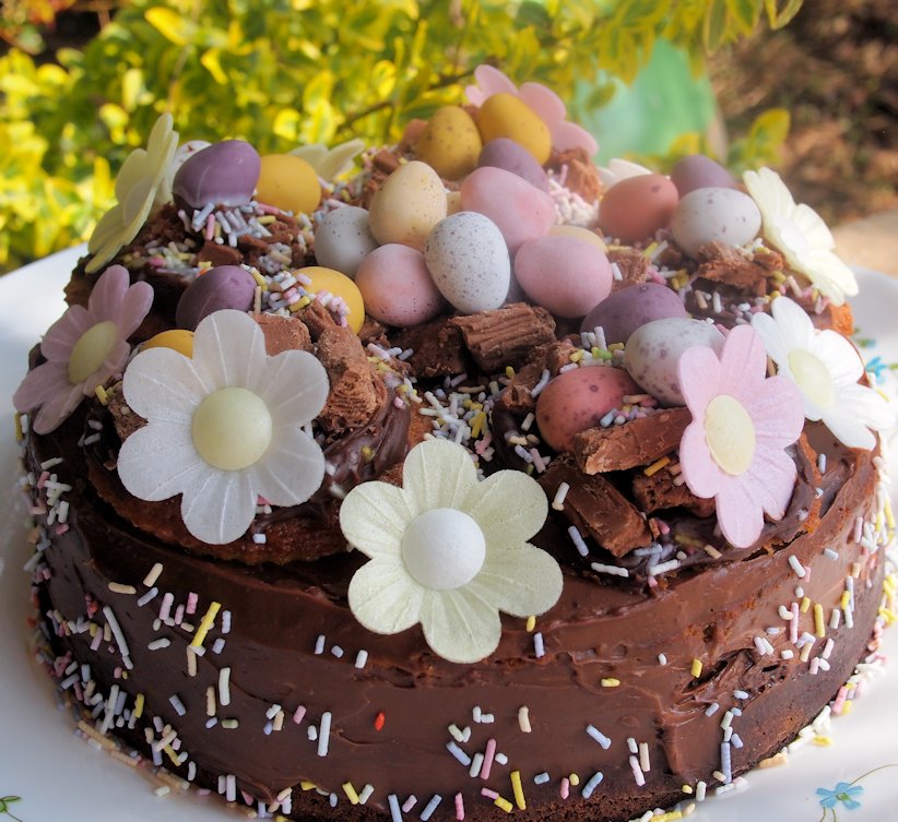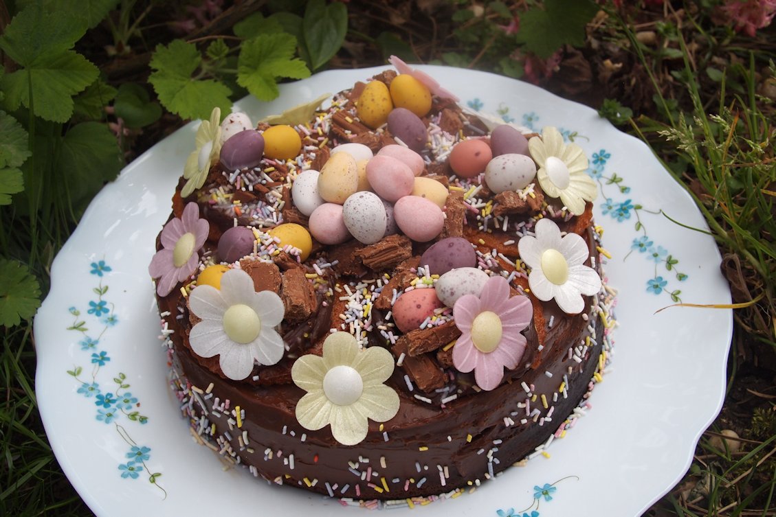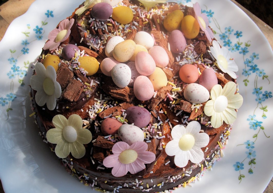 Spring has sprung with a fresh orange cake, decorated with chocolate cream cheese and wafer daisies, as well as mini chocolate eggs and flake bars.
