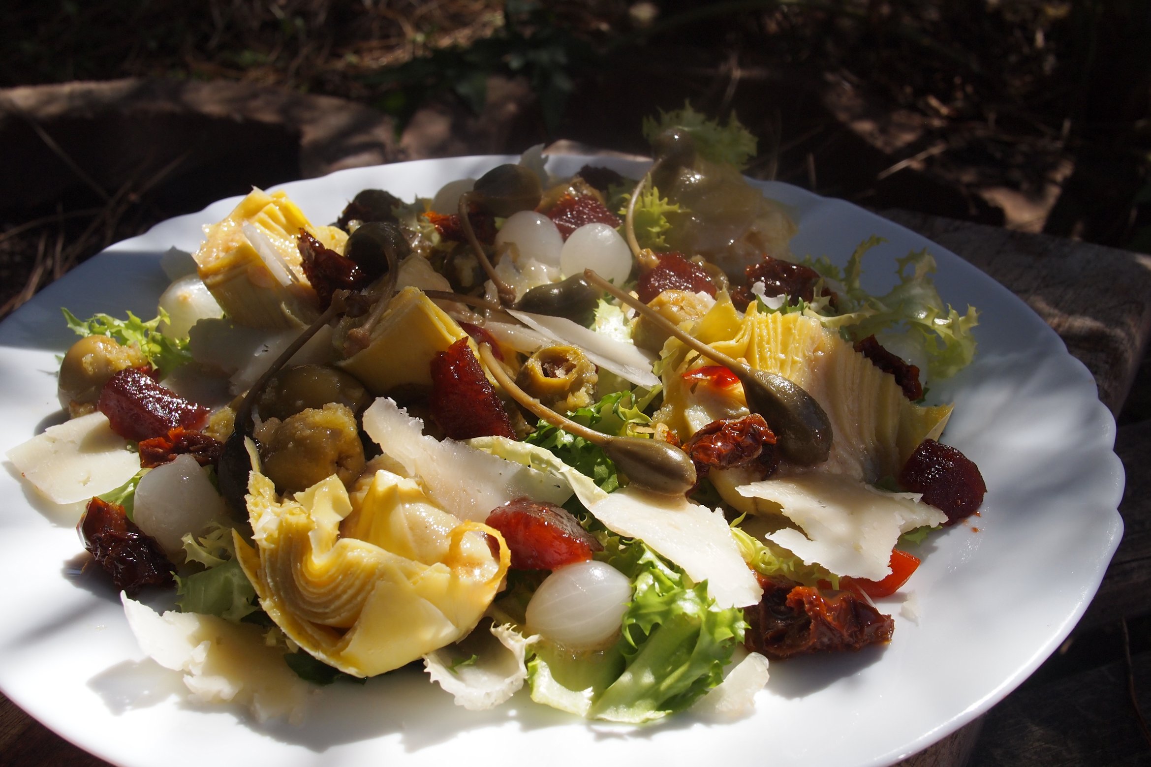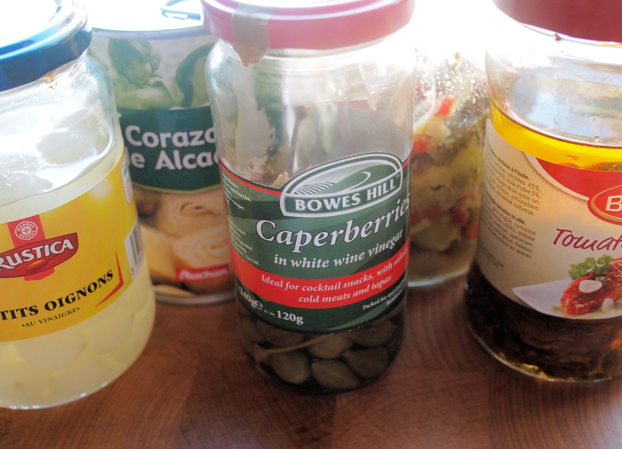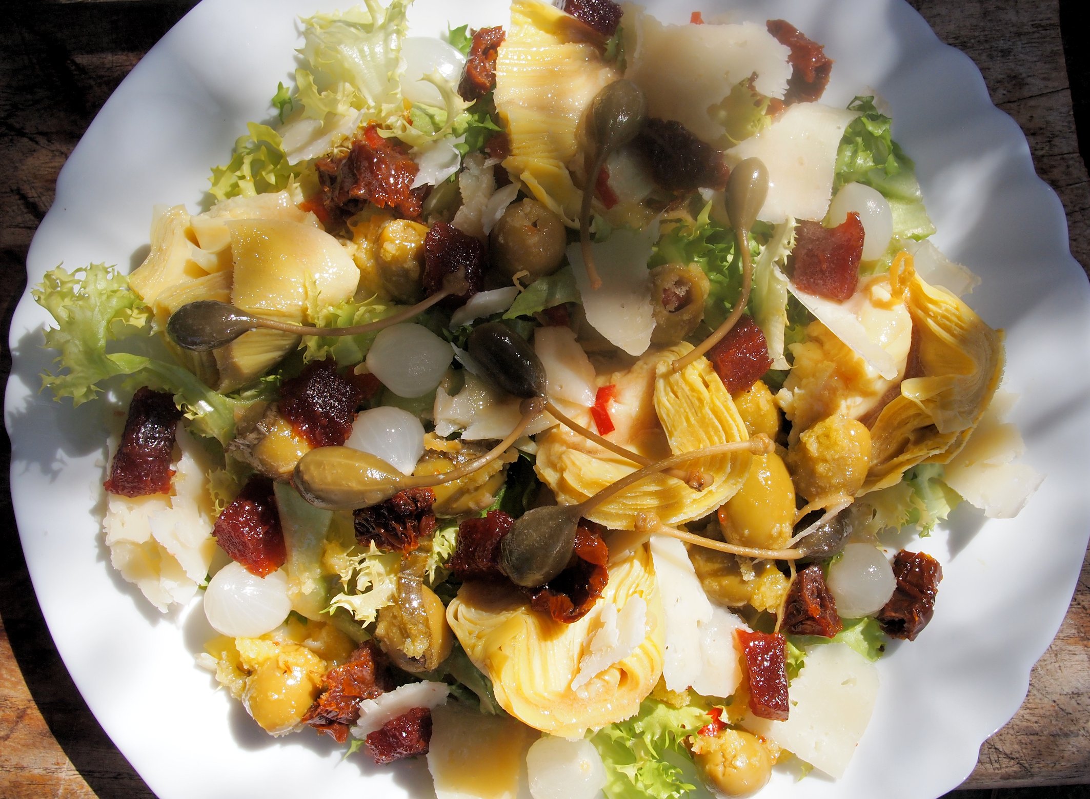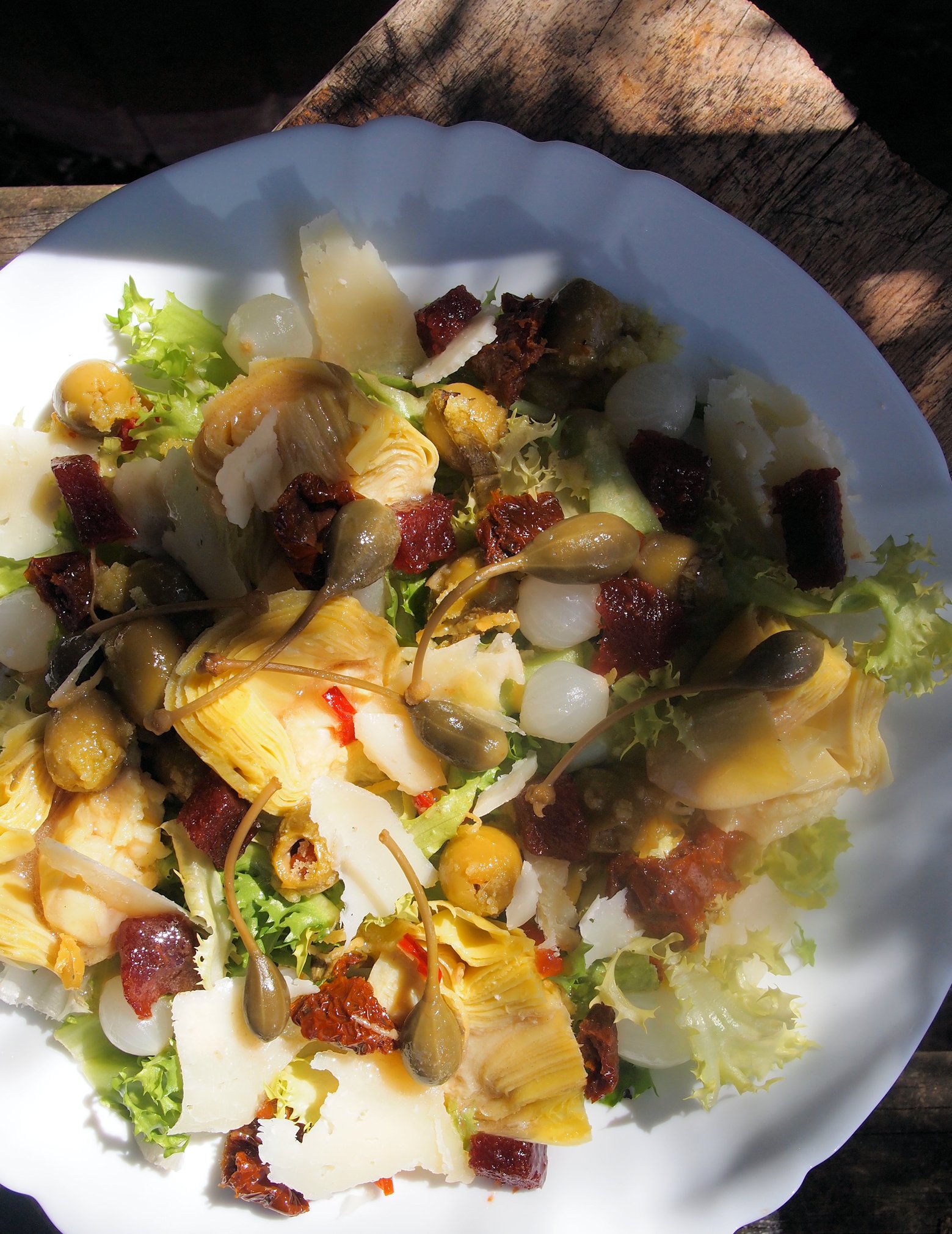 A fabulous gourmet salad made with bits and bobs from opened antipasti jars; I used sun-dried tomatoes, artichoke hearts, pickled onions, olives and caper berries, as well as some home-made Membrillo with slivers of Spanish Manchego cheese. ( Manchego is a delicious Spanish hard cheese made of sheep’s milk, and Membrillo is quince paste or quince cheese.)