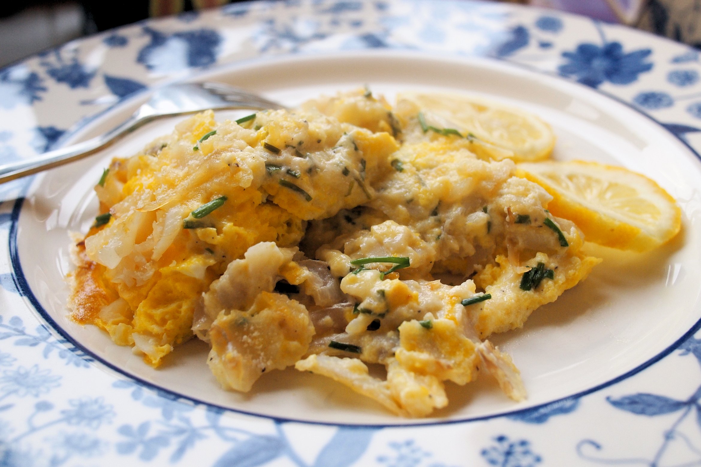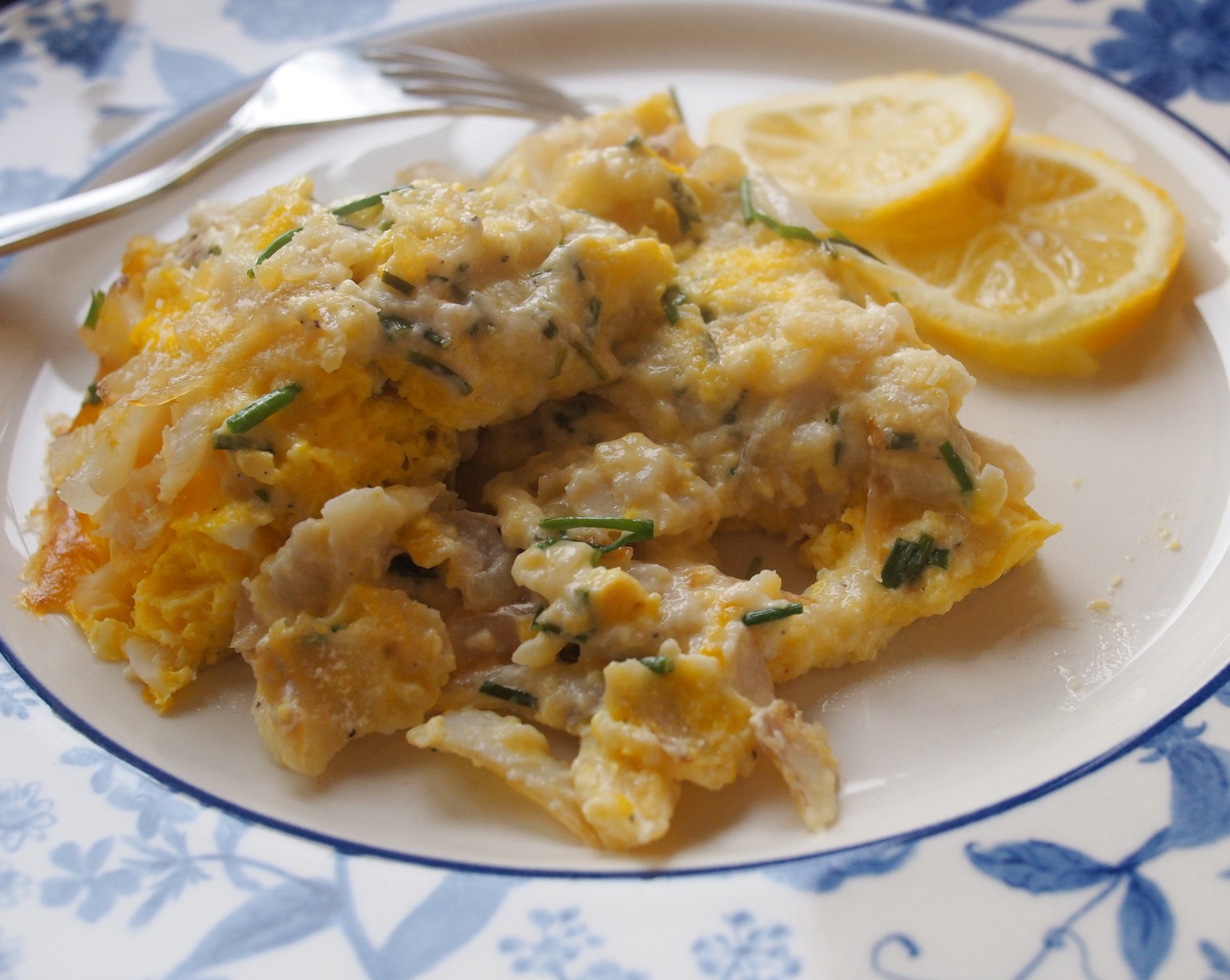 It’s not hard to make this classic recipe if the smoked haddock is prepared as wonderfully as the fillets I received, which were boned and skinned already. But, the original recipe is a little tricky and involves several methods including making a béchamel or hollandaise sauce; it is a truly wonderful creation, a fluffy open-faced omelette made with smoked finnan haddock and fresh free-range eggs, oven baked in the final stages to achieve a golden brown top. So, to bring this recipe right up to date and to aid a travel worn and busy chef, that’s me, I adapted the original recipe mercilessly and came up with this version which is simplicity itself. I have still retained the essential elements of smoked haddock, eggs and Parmesan cheese, but have replaced the fiddly sauces and cooking methods with a crème fraîche mixture that is lighter and not as rich. I hope you enjoy this as much as we all did last night, served simply with brown bread and butter and some lemon slices……..watercress and salad leaves also make a great accompaniment to this lovely and luxurious omelette.