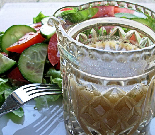 Kristy’s byline on her blog is “One woman’s ethical culinary adventures…..with wine of course” and that sits VERY comfortably with me! And this salad dressing was developed as she had an epiphany moment on tasting some rather nice Venturi-Shulze’s balsamic vinegar. I LOVE a good Balsamic Vinegar and as I have some stashed away in my pantry, and as I also COLLECT salad dressing ideas and recipes, this was rustled up in a trice and enjoyed with a simple platter of lettuce leaves, cucumber and tomatoes.