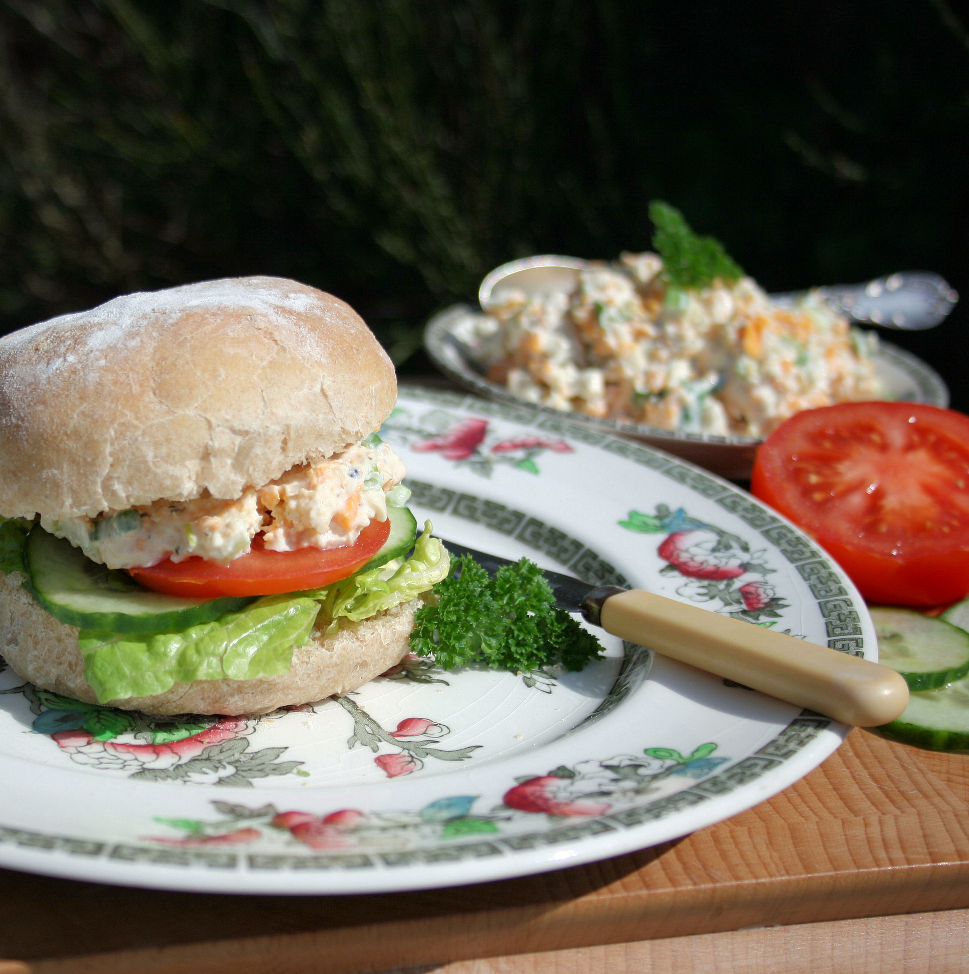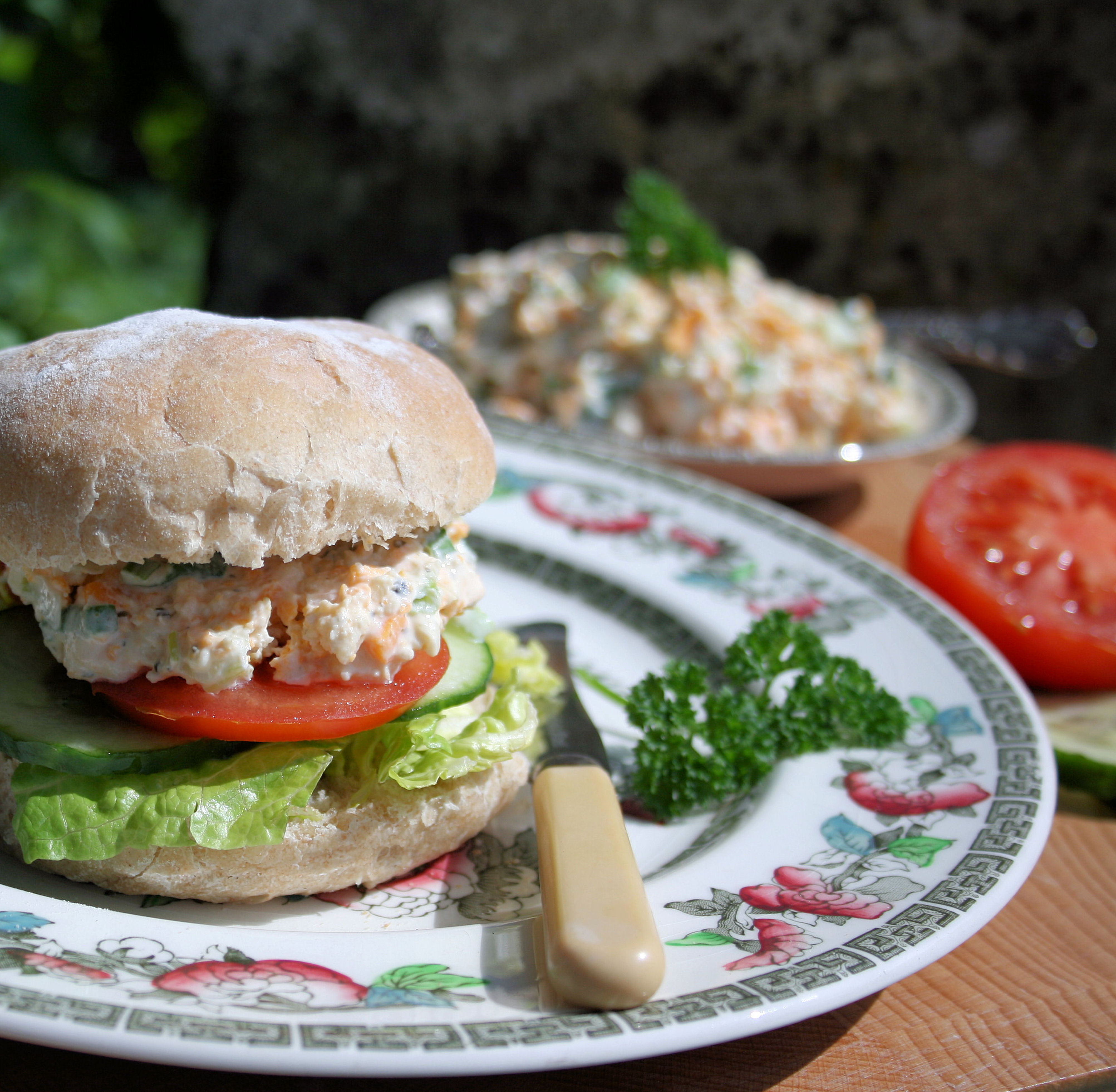 Three Cheese Spring Spread: A family favourite and a great spread not just for sandwiches, but also for toast and crackers. Red Leicester, Cheddar and Cream Cheese are mixed with spring onions and parsley, to make an extremely tasty sandwich filling, especially good with lettuce, cucumber and tomato. I like to use bread buns, rolls or baps when I use this as a sandwich filling, but any sliced bread would also be suitable. This keeps in a covered container in the fridge for at least a week.