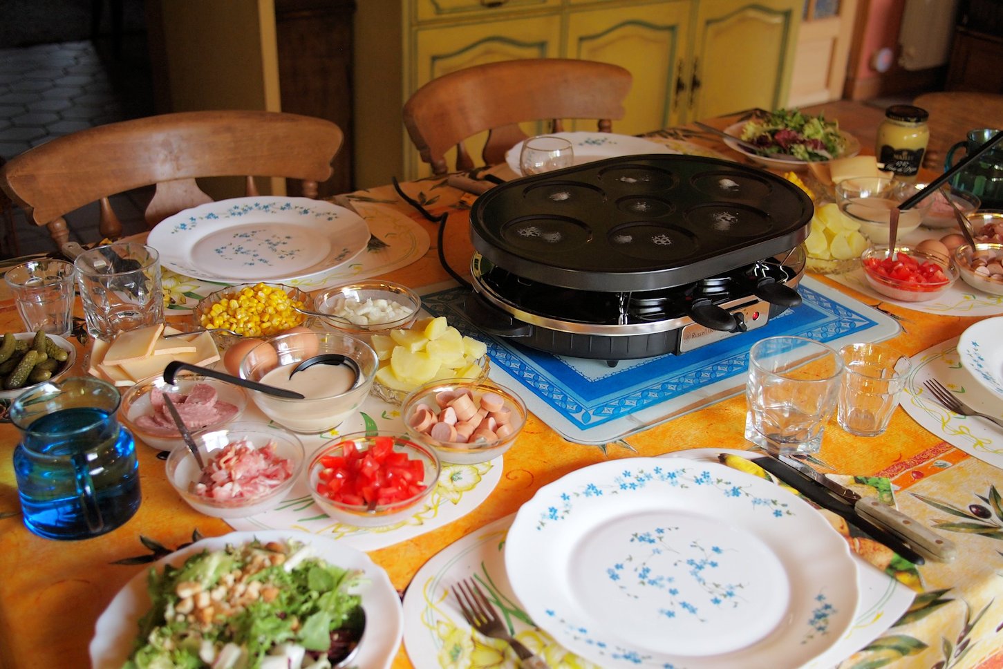 I also like to have a BIG bowl of salad on the table as well as lots of crusty bread! I am famous for my raclette parties and I am sorry to say that many a party has ended with people staying the night, unbeknown to me until next morning, and molten cheese being soldered to the tablecloth – hence my insistence for paper covers or a proper French oil cloth now, as seen in the photos! You can sit at the table for hours, cooking and chatting, and drinking, and melting cheese…..it’s tactile, it’s unique and it’s a wonderful way to sit down with family and friends rather than slaving over a hot oven – they can all slave over a hot grill instead! You can host themed raclette evenings, I held a fish and seafood one once, with scallops, prawns, small pieces of fresh salmon and smoked salmon on the table, with fresh blini batter……and caviar – it was held on New Year’s Eve and was a fabulous meal…..I had all the appropriate trimmings on the side, and we even scrambled our own eggs on top of the machine too. But for summer, if we have one, take the machine outside and hook it up to an extension lead and offer all the list of ingredients above but with fresh peppers, olives, chunks of feta cheese, halloumi and little cherry tomatoes.
