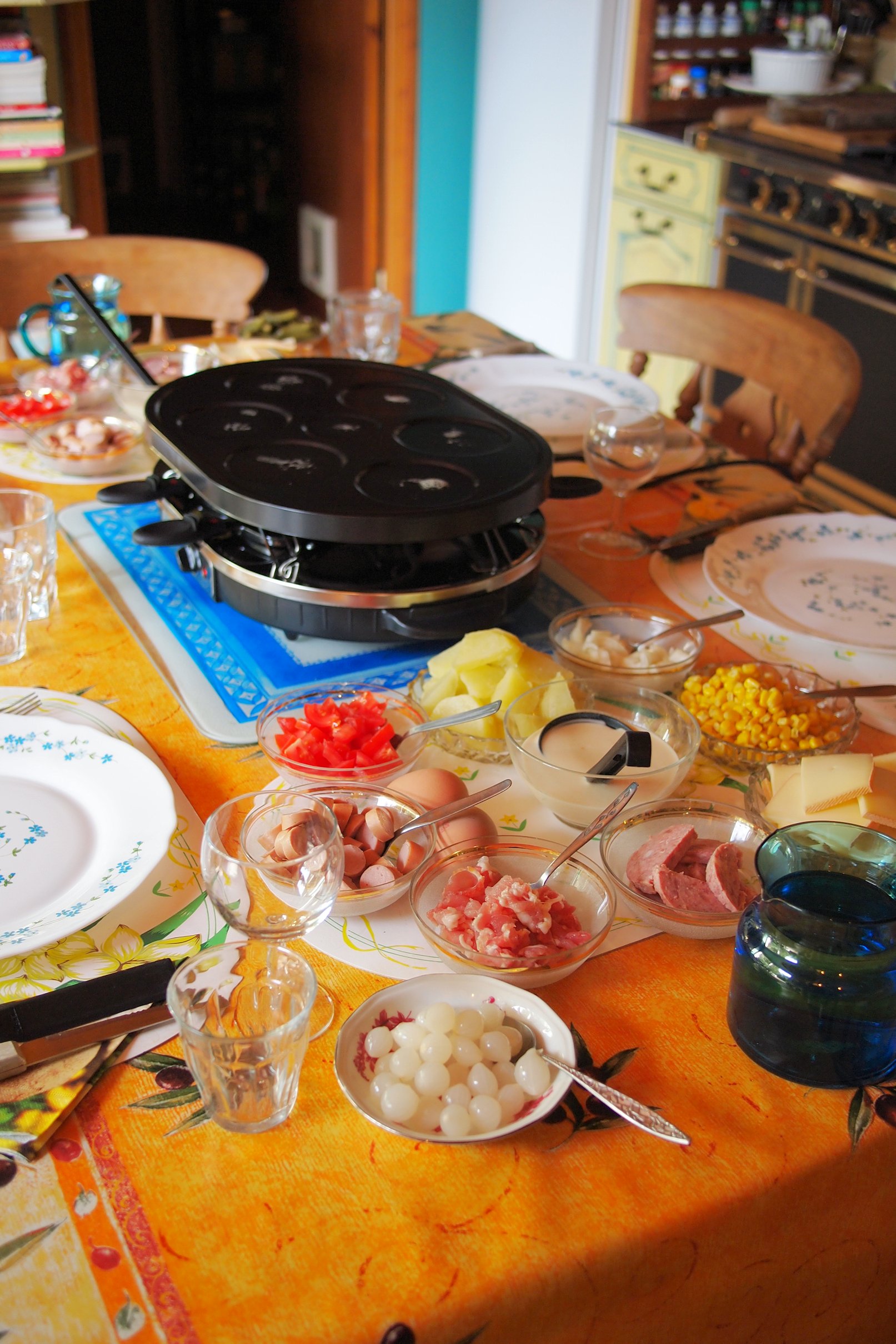 Yes, it is such a wonderful thing. Everyone gets cooking and can eat what he wants. Sometimes we also use pizza dough to bake little pizzas in the raclette pans.
