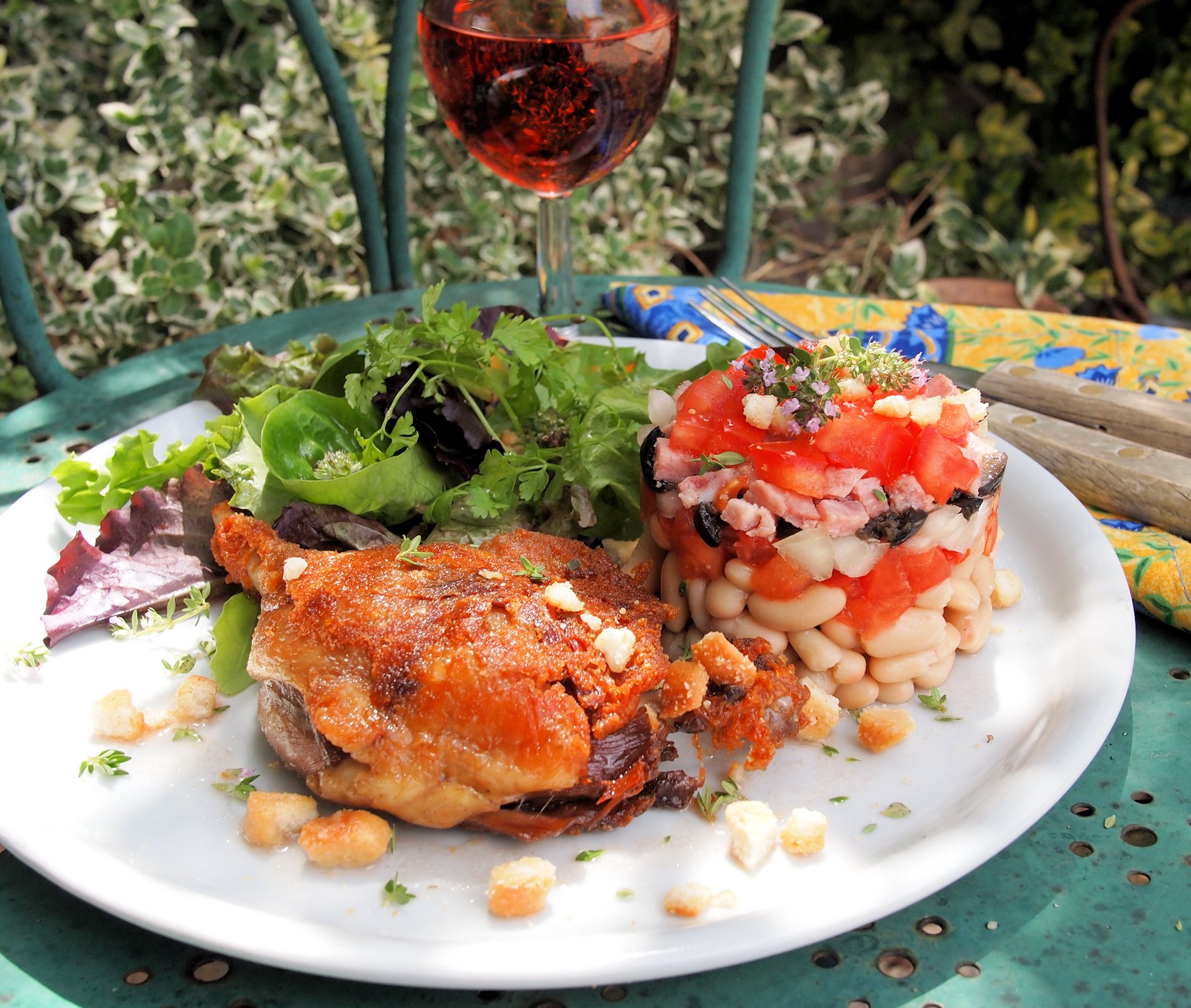 It’s quite a “cheffy” recipe, well, insofar that I have assembled the bean salad in a cooking ring, which looks great on the plate actually…….and, ever better news, my “salad stack” did not collapse either! I took all the principal elements of a classic Cassoulet and reinvented the dish for summer. A classic Cassoulet contains haricot blancs (white haricot beans), tomatoes, onions, preserved duck, garlic sausage, wine, thyme and bread crumbs….obviously there are variations on this recipe, and different parts of South West France all have their own regional recipe with the “correct authentic” recipe being hotly debated. I was delighted with this recipe, the flavours worked so well together and the contrast of textures was also very clever, and worked perfectly, as did the hot duck with the cold bean salad and mesclun salad leaves. The flavours were definitely VERY Sud de France, and we both enjoyed this last Sunday, as an alternative Sunday Lunch, with a glass of rose wine on the terrace, whilst the sun was out……. briefly! My ingredients list contained nearly all of the key elements needed for the hot and comforting version of this dish, with a few black olives thrown in for good measure.