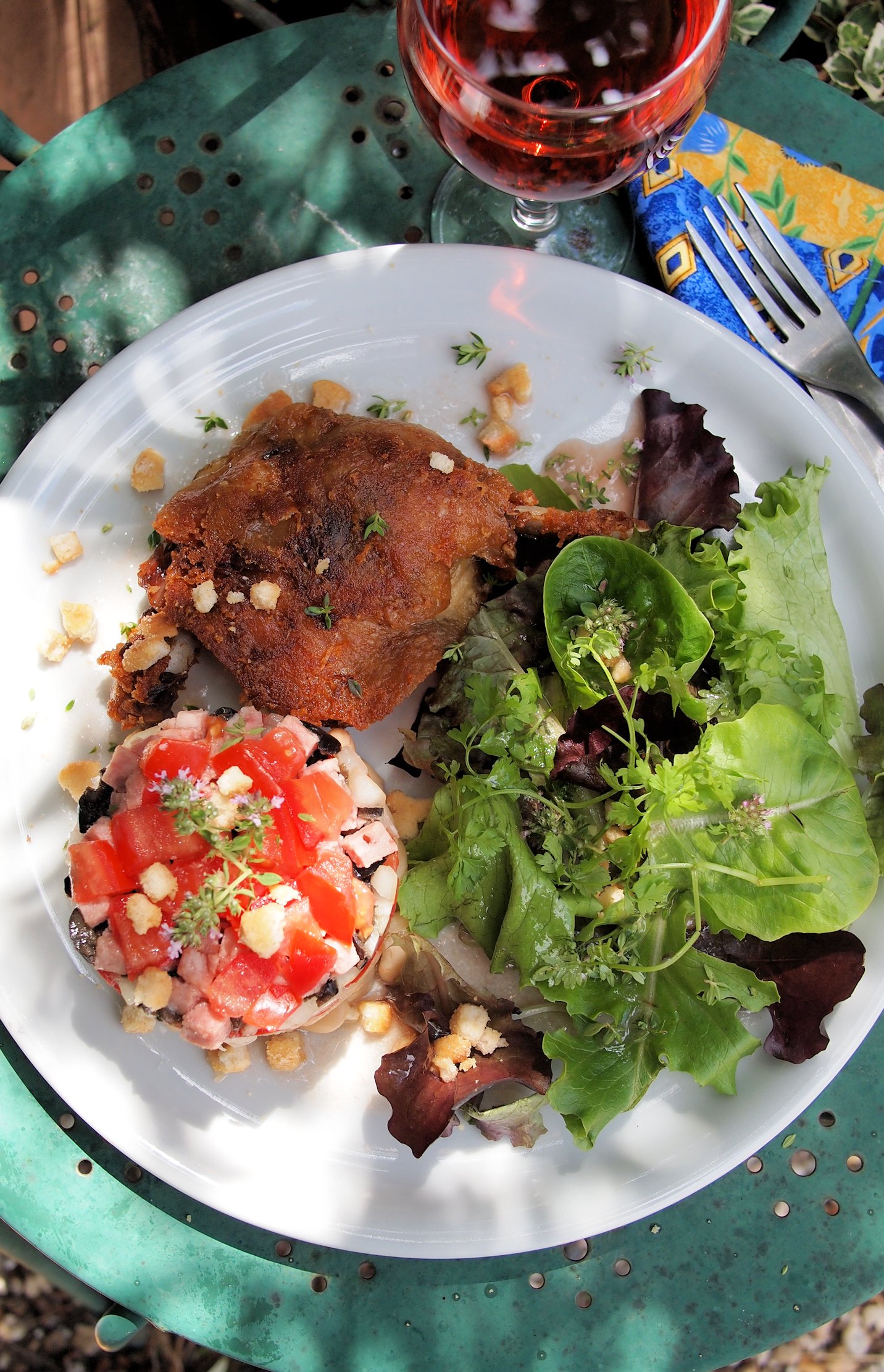 Deconstructed cassoulet in a summer salad with crispy duck legs and mesclun salad.....all the elements of a winter warmer but lightened up for an elegant and very French lunch!