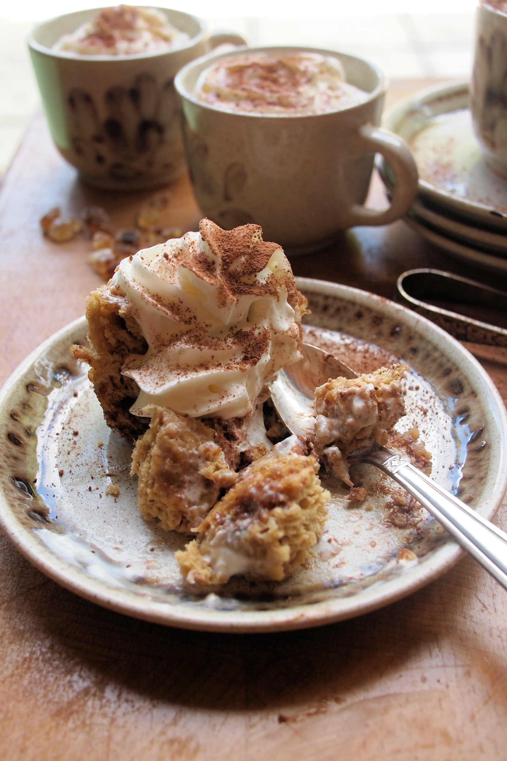 Delightful little chocolate chip coffee cakes, baked and served in coffee or tea cups for a fun tea time treat! These cakes are baked in the cups, but you can also use the microwave to cook them in under 10 minutes, although the texture becomes more like a pudding, than a baked cake.