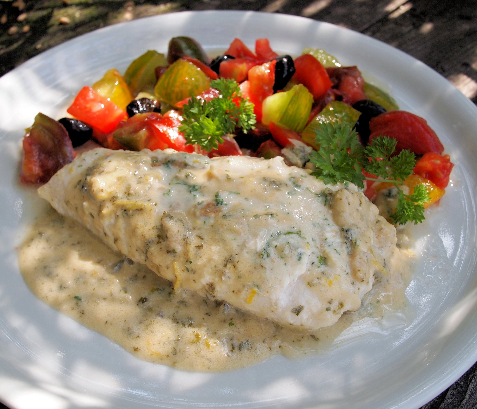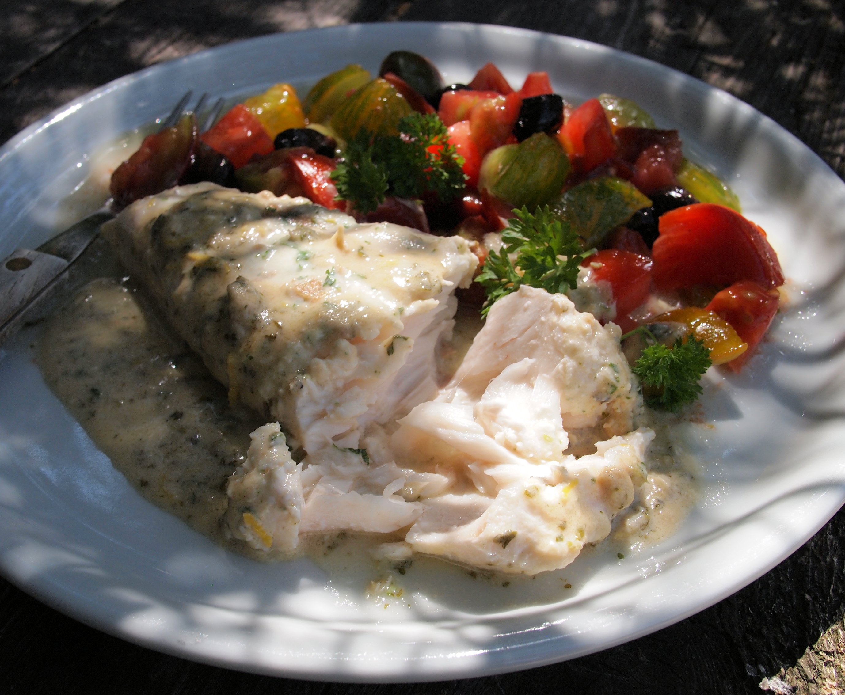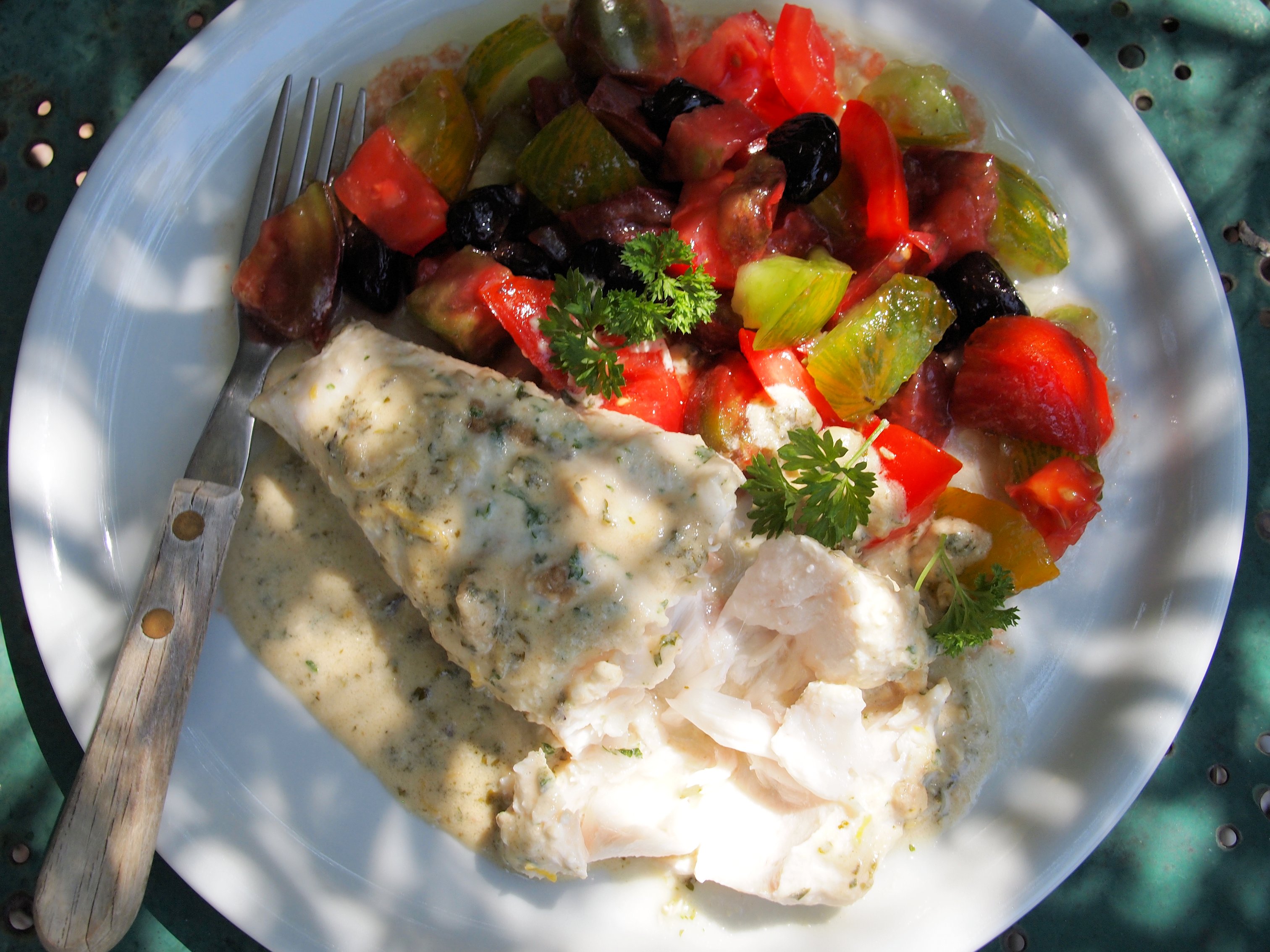 All that was needed to complete this sumptuous fish dish was a FABULOUS FRESH Heirloom tomato salad with olives…..I used some amazing “ancienne” tomatoes that came from a friend’s potager, and they included some Black Russian and Green Zebra tomatoes.……as well as some HUGE beefy marmande tomatoes…..it was a delicious meal. We used to serve this fish dish with pilaf or couscous in the restaurant, which was great for mopping up the sauce! Salad would also be a lovely accompaniment too, as well as the ubiquitous crusty bread.