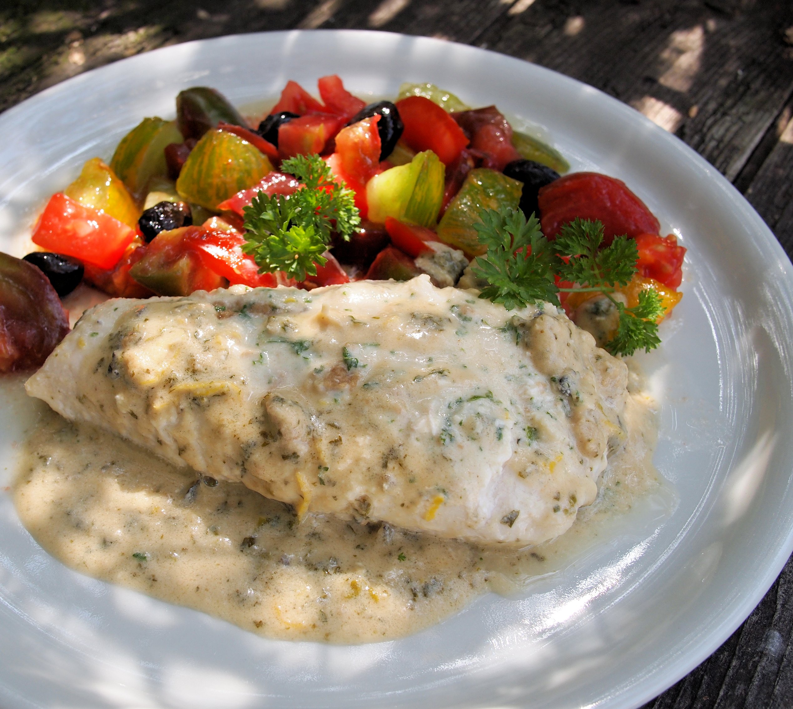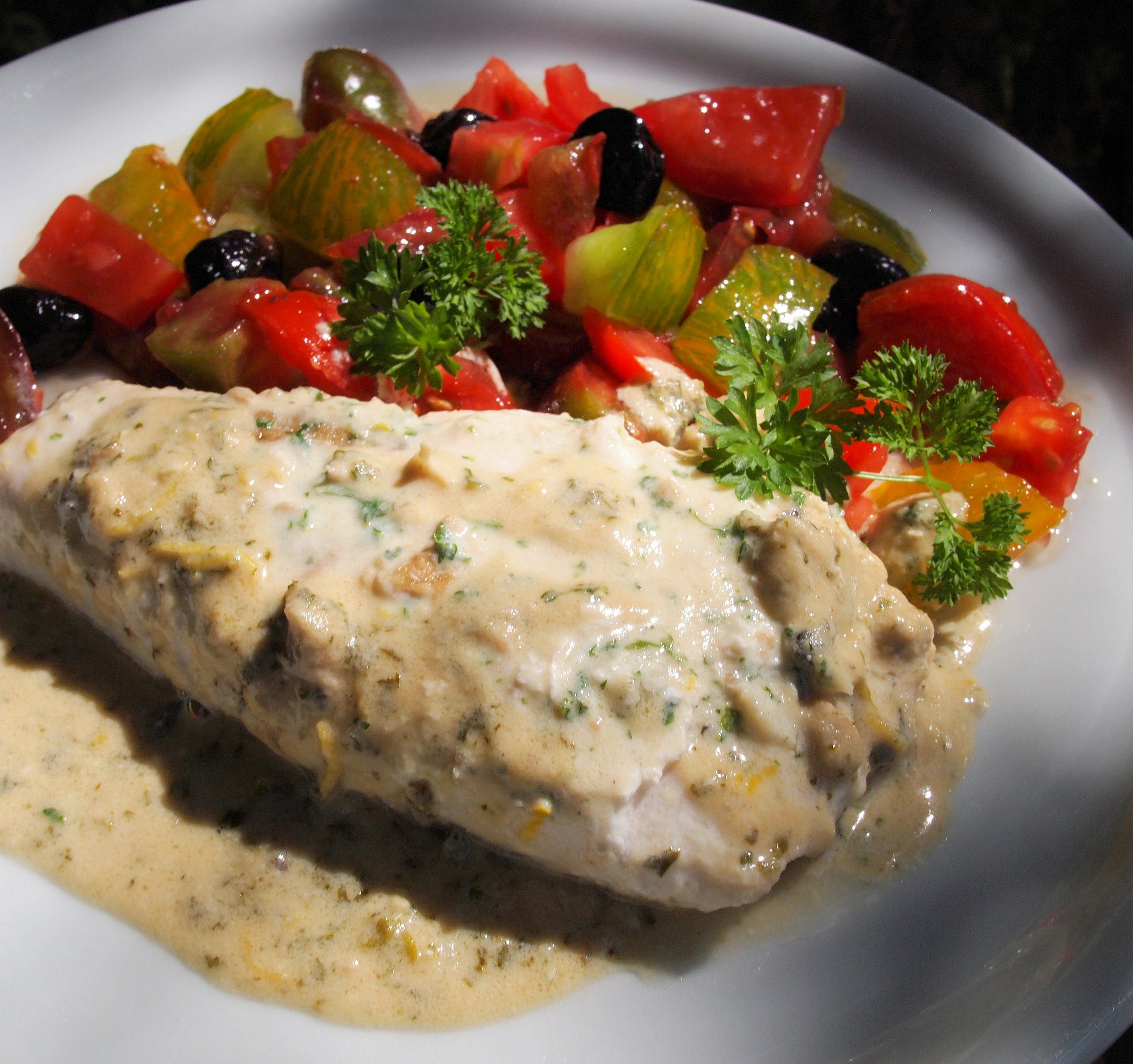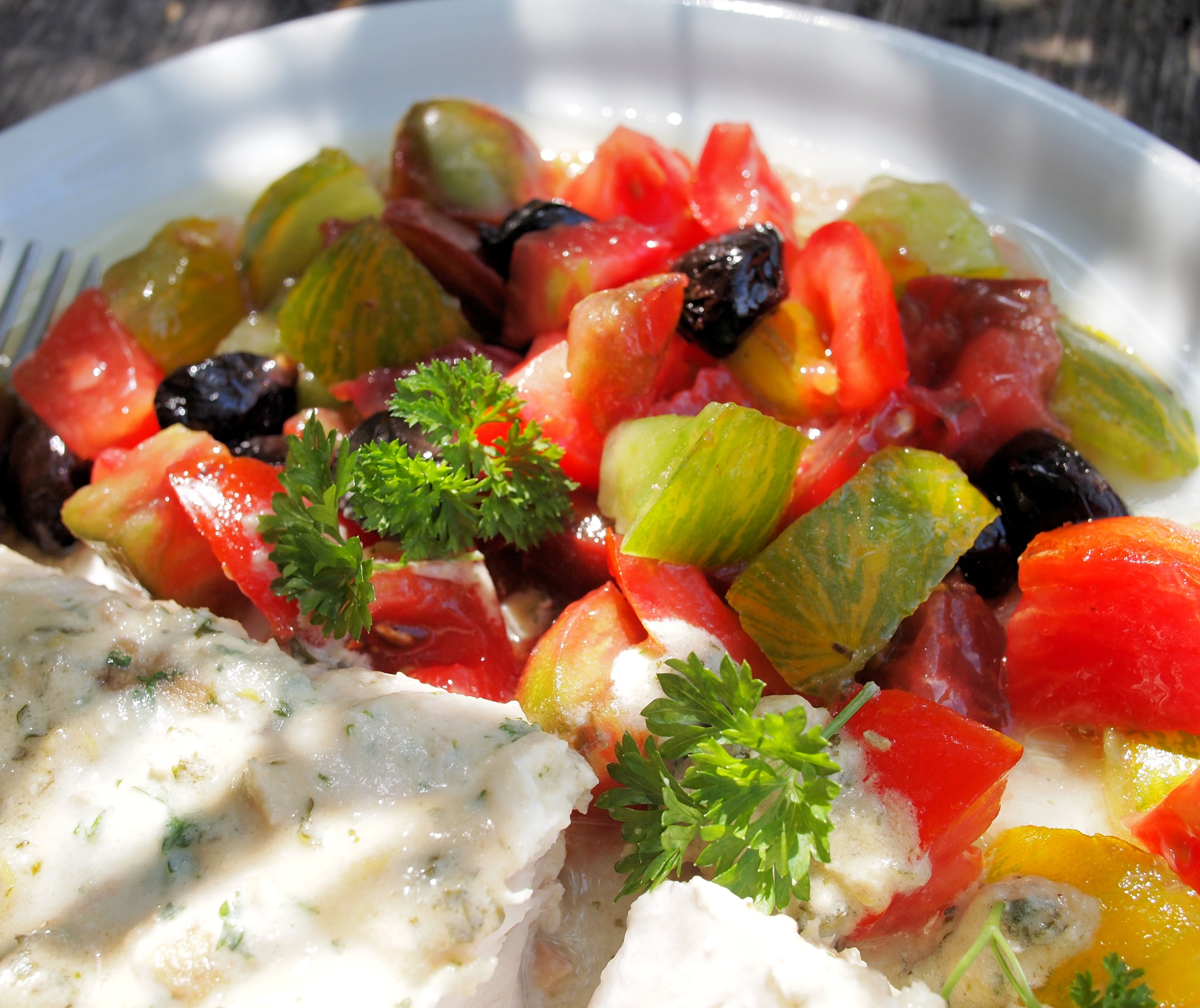 All that was needed to complete this sumptuous fish dish was a FABULOUS FRESH Heirloom tomato salad with olives…..I used some amazing “ancienne” tomatoes that came from a friend’s potager, and they included some Black Russian and Green Zebra tomatoes.……as well as some HUGE beefy marmande tomatoes…..it was a delicious meal. We used to serve this fish dish with pilaf or couscous in the restaurant, which was great for mopping up the sauce! Salad would also be a lovely accompaniment too, as well as the ubiquitous crusty bread.