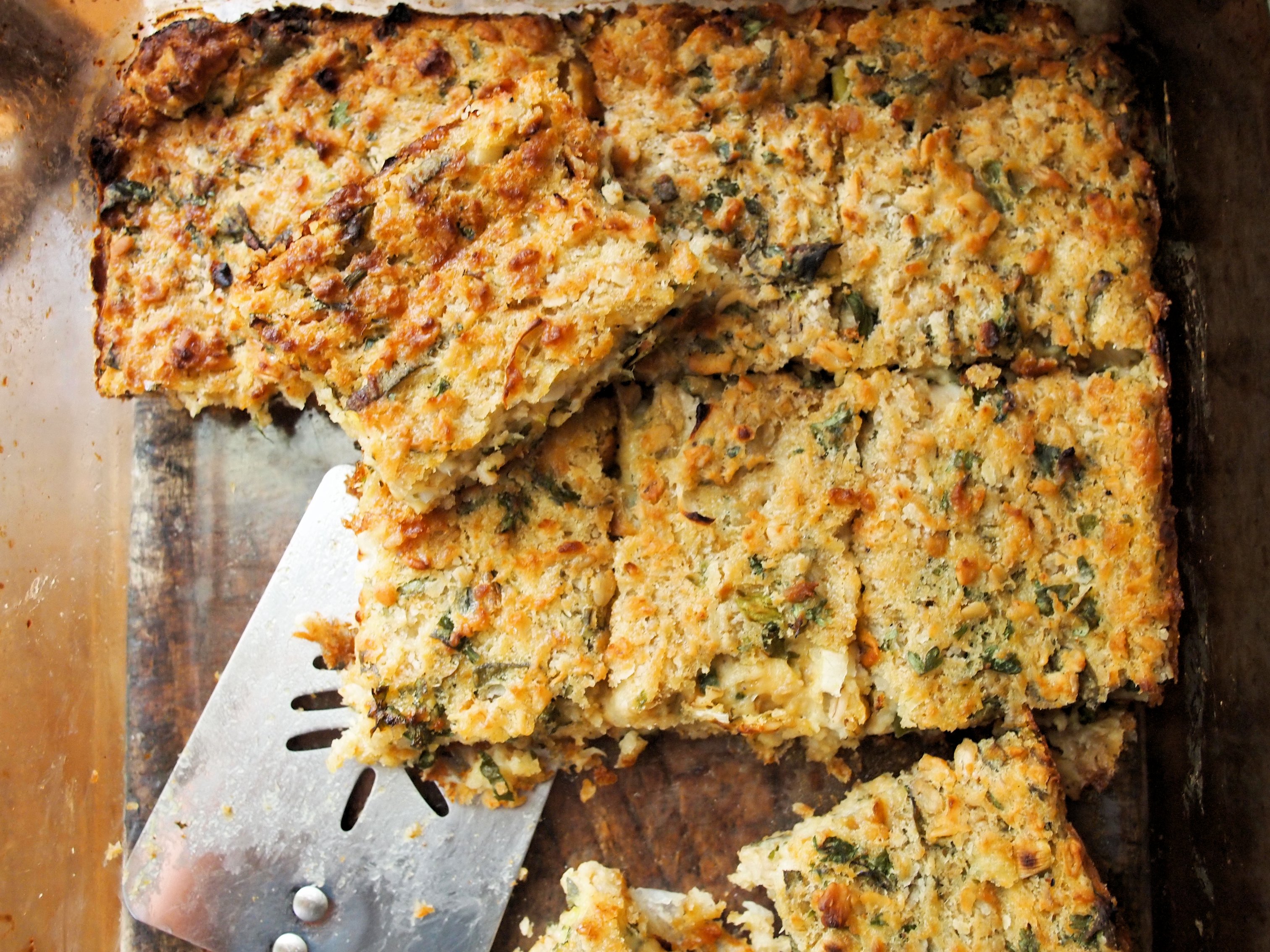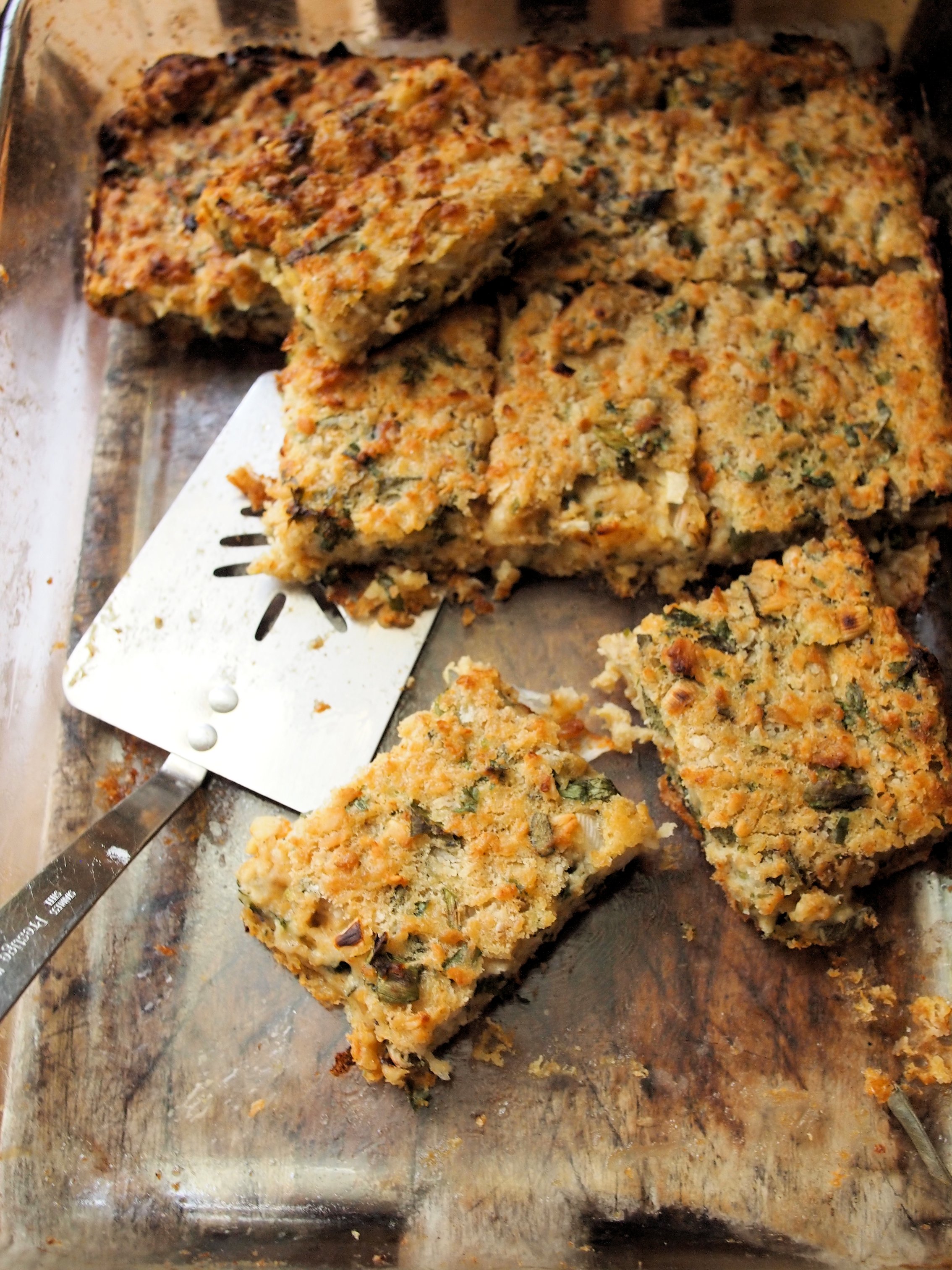 Step 4 | Spoon into a baking dish or roasting tray - metal is better than glass and smooth out to a thickness of about 1" (3cms) and bake for 35 to 45 minutes, or until the season pudding is golden brown and has a nice crust. |