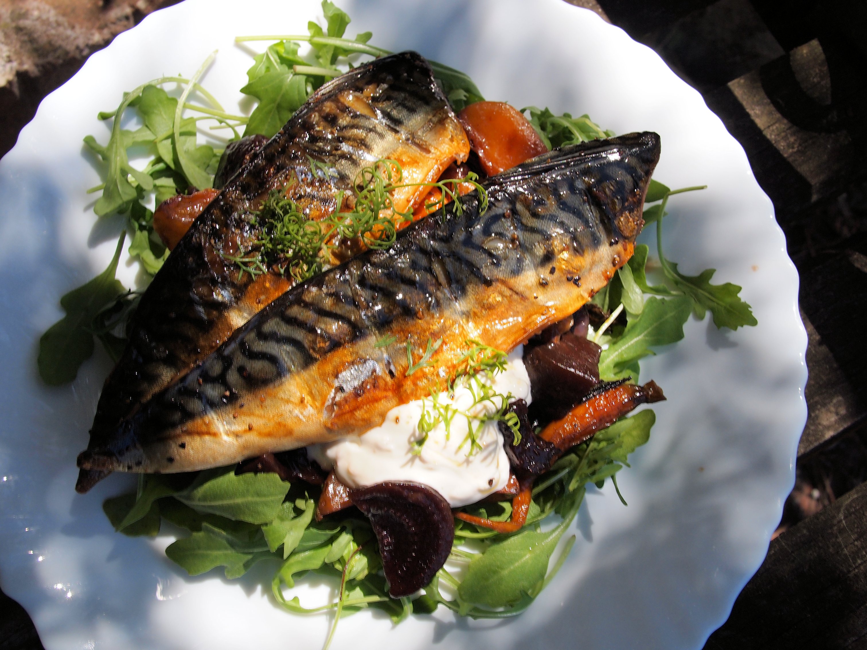 An elegant way to serve smoked mackerel fillets, which are inexpensive, sustainable and very tasty. The mackerel works wonderfully well with the horseradish cream, which cuts through the oiliness of the fish, and the beetroot and carrot salad add interesting and well balanced flavours.