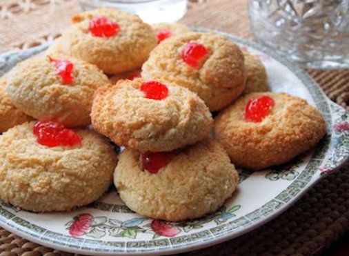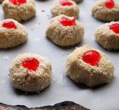 Step 3 | Roll walnut sized pieces of the mixture into balls and toss in rolled oats or desiccated coconut. Place on baking trays, flatten slightly and place a small piece of cherry on each biscuit. |
