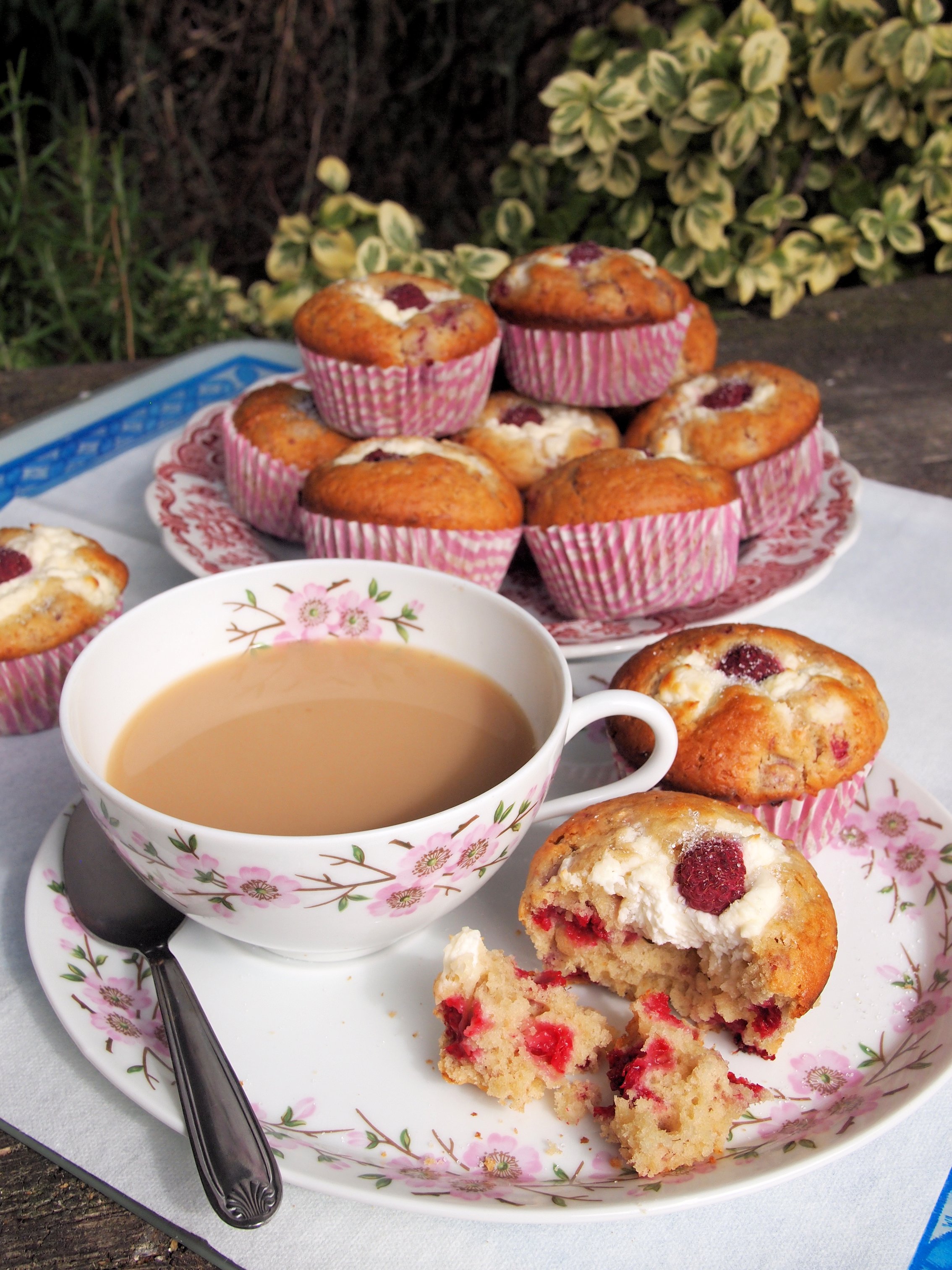 These were weighed, mixed, baked and on the tea table in just over half an hour! Freshly picked raspberries from the garden were added to the batter and the addition of the cream cheese was a brilliant idea that made the muffins moist and almost like cheesecake cakes! I made a pot of tea and we had one each – the rest I popped into the freezer for later.