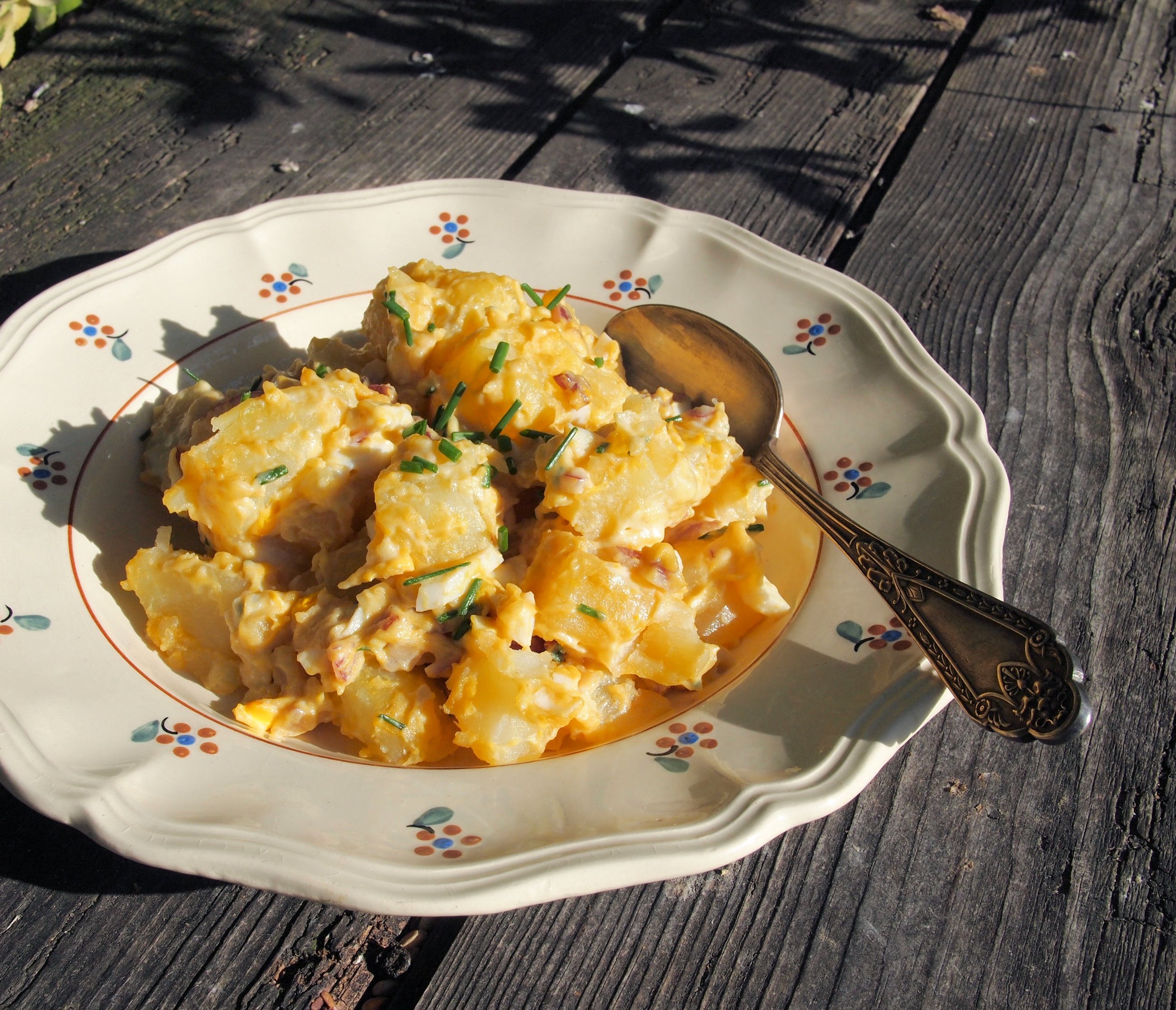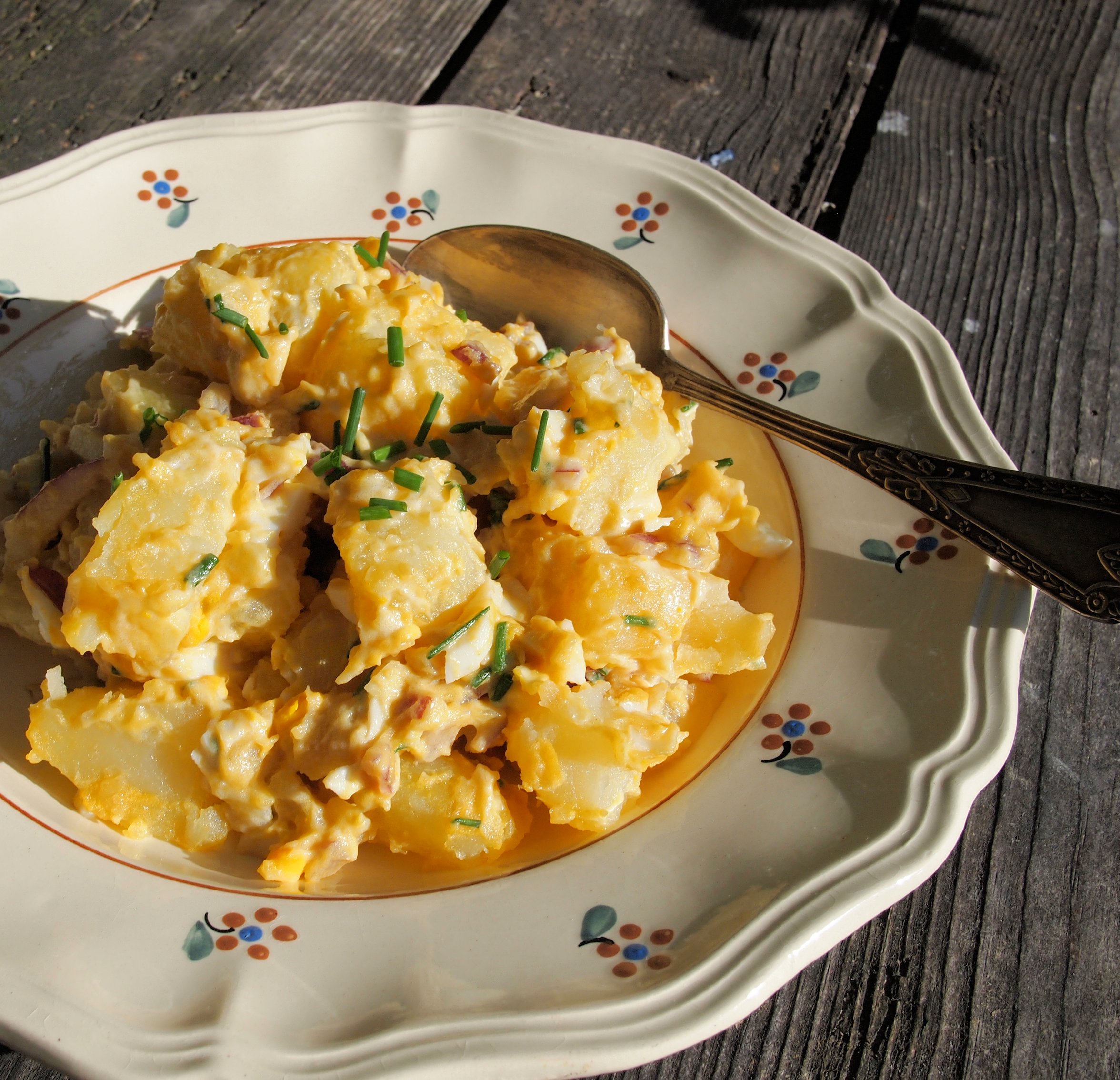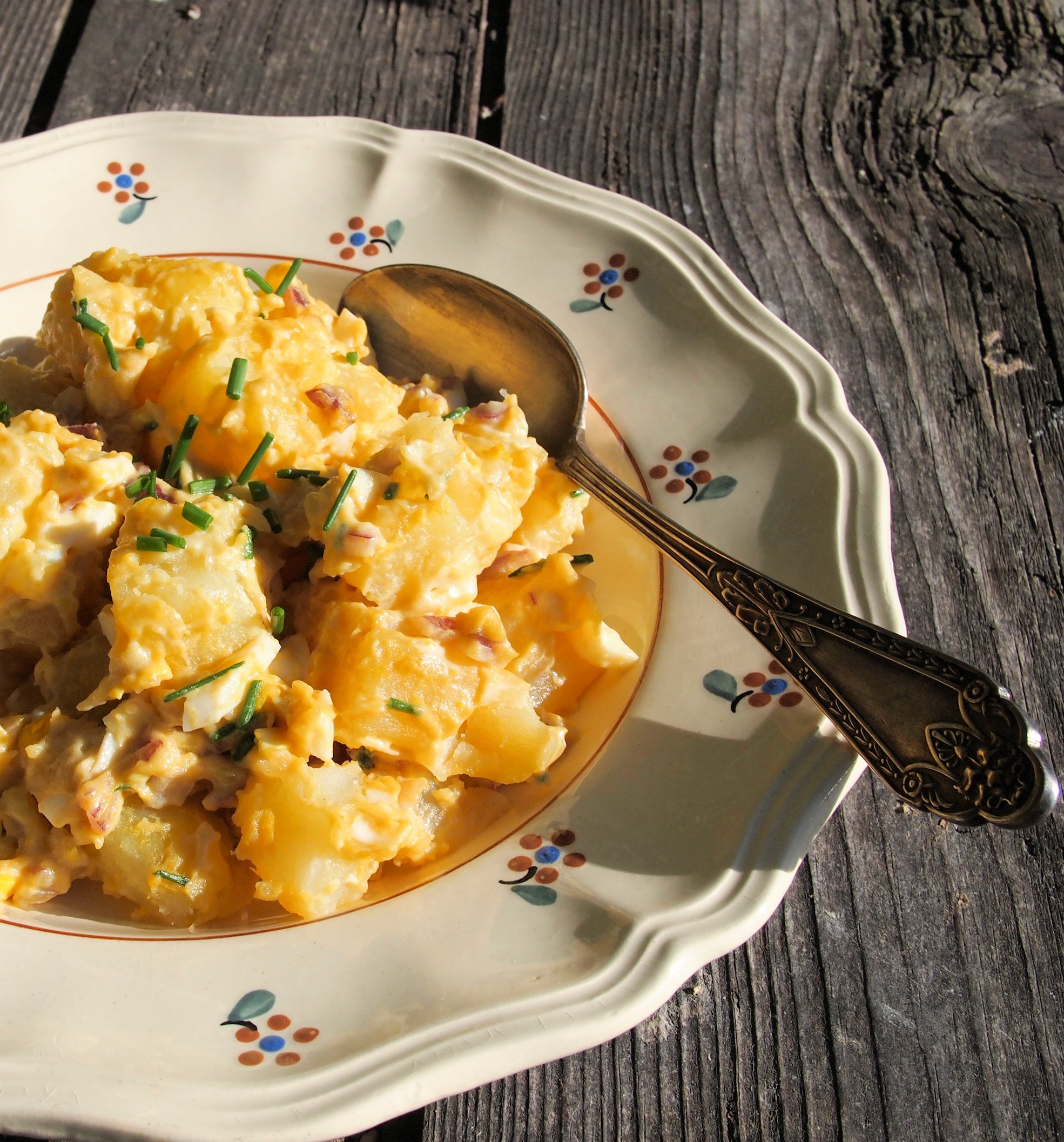 So, where do the vintage plates come in to the post? Well, the lovely old plate, or should I say bowl, that my potato salad is being served in, is part of a collection of about half a dozen old vintage French plates I have by Sarreguemines, a pottery that specialises in every day dining ware. The plate may look sober and has a very simple design adorning the edge, but it has a creamy resonance that harks back to past times, and every time I take the plates or bowls out to use at our dining table, I always wonder who used them, or owned them, before me, and what they ate from them. I am sure that this rustic potato salad would have been very welcome, and I am sure that it would have been made with freshly dug potatoes, and maybe a bowl of thick, creamy home-made mayonnaise.