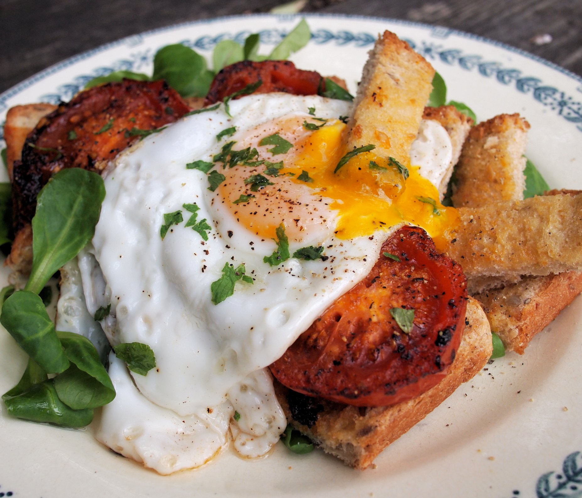 This could be classed as eggs and tomatoes on toast, but, I have added a French twist to it and called it a tartine – which is essentially an open sandwich in France, much like a Danish sandwich. I have also added an extra treat, insofar that I have suggested cutting some of the toast into dipping fingers, affectionately known as “Soldiers”. The recipe is simple and yet quite elegant as it is served with lamb’s lettuce (mache) and is finished off with a garnish of finely chopped lovage, adding a lovely savoury and slightly yeasty taste to the dish. It’s a perfect recipe for a late weekend breakfast, and we both enjoyed it today with a pot of fresh coffee and orange juice.