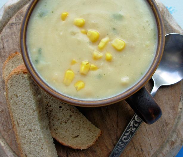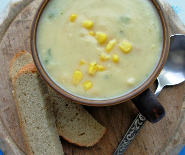 I wanted to tell you more about Jenni, but her site is right-click disabled, so, why not pop over there to read more about here…….About Jenni, and let her know that I sent you! Anyway, she has LOTS and LOTS of lovely recipes, and I had difficulty in choosing just one, but, finally I plumped for SOUP again, but, it is the season for soups and stews, and I really loved the look of Jenni’s Chicken Corn Chowder, so the decision was made and the soup was made one day last week AFTER I had cooked a roast chicken here: Lazy Blue and White Lunch: Garlic Roast Chicken with Root Vegetables Recipe.