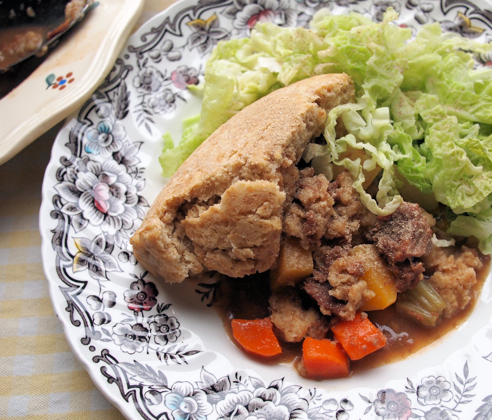 A delicious meat and vegetable steamed pudding that would have been popular as a family meal during the war; the meat is padded out with tasty seasonal root vegetables and the suet crust is made from a combination of flour and oatmeal, for a nutty taste and texture. Serve with gravy and steamed seasonal vegetables. I used a very handy packet of Scotty Brand prepared casserole vegetables in my pudding.