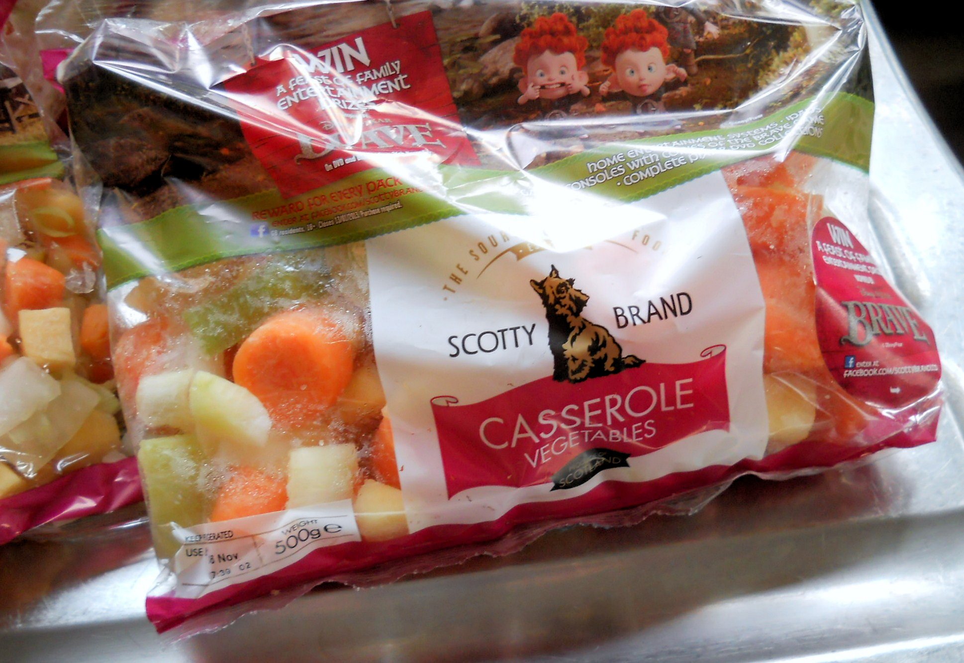 - 120zs (300g) mixed prepared vegetables such as carrots, swede, potatoes, turnip, leeks, onions and celery (I used a bag of Scotty Brand prepared Casserole Vegetables)