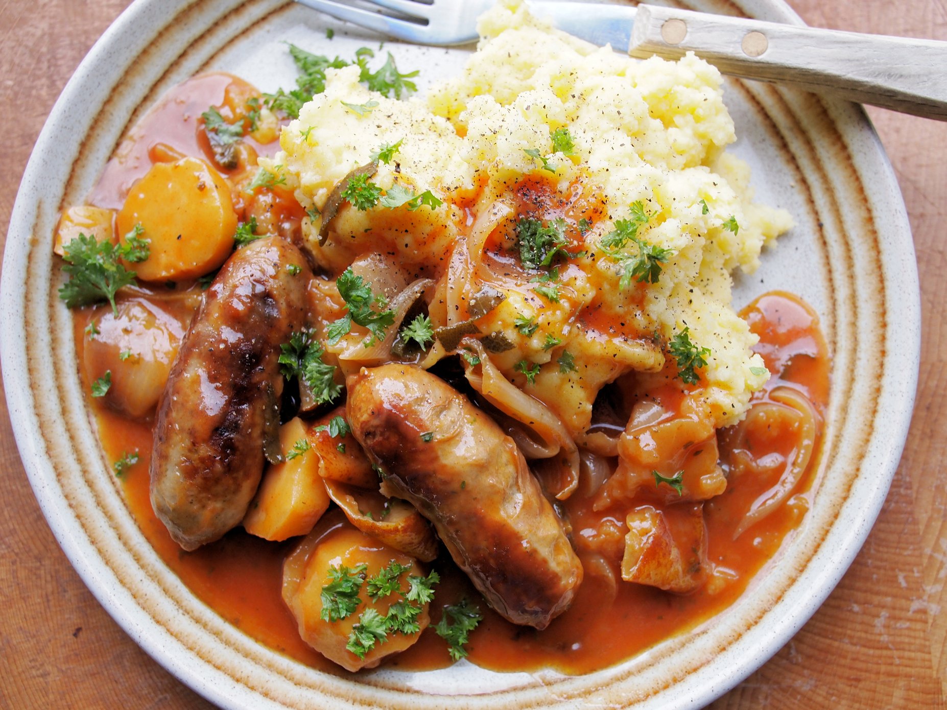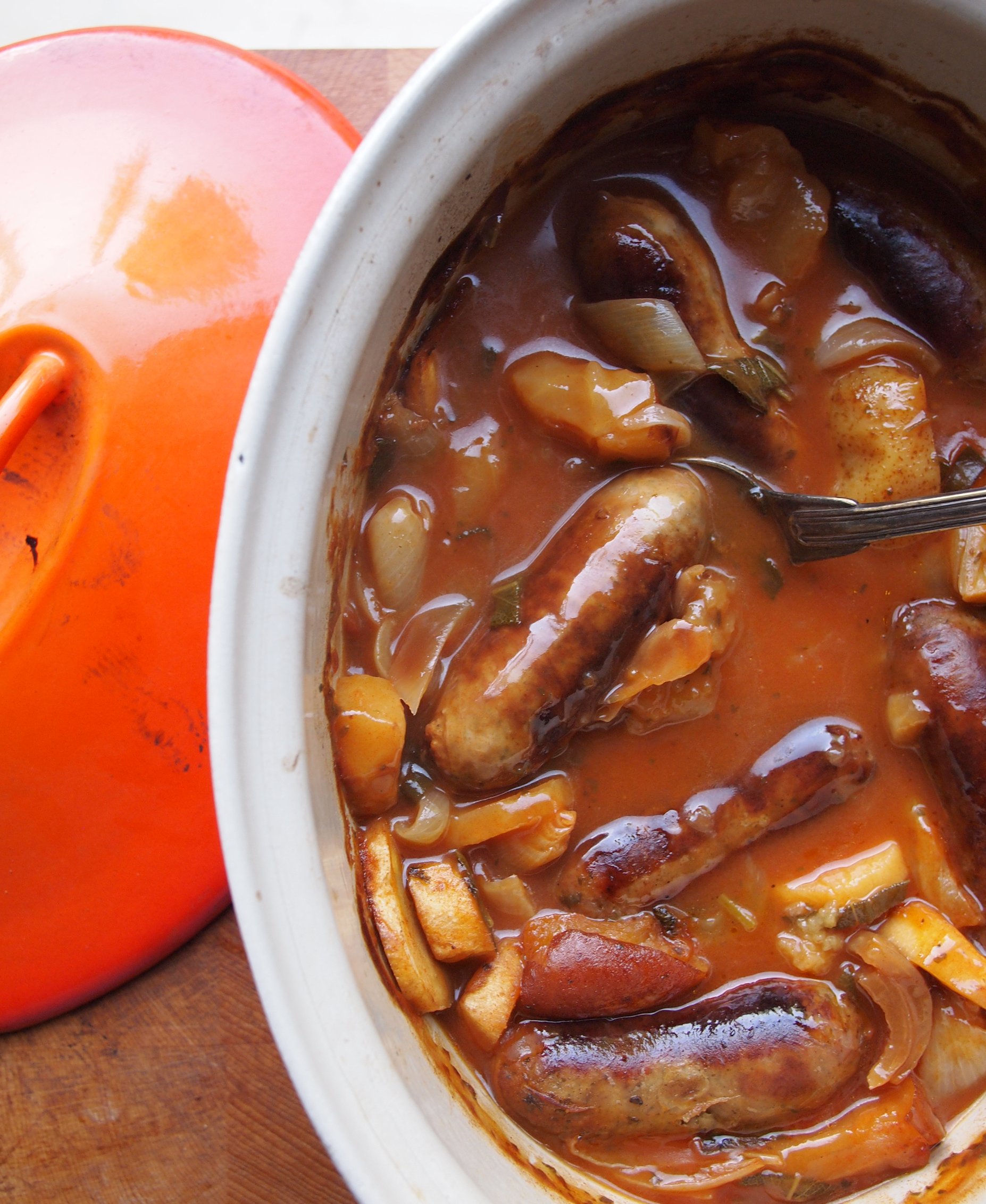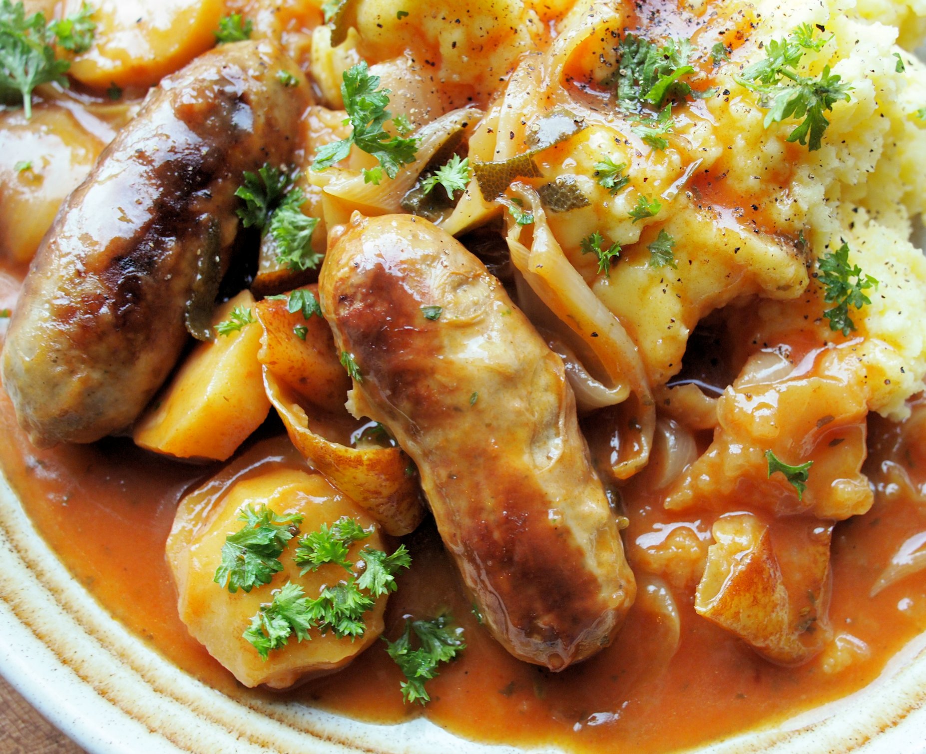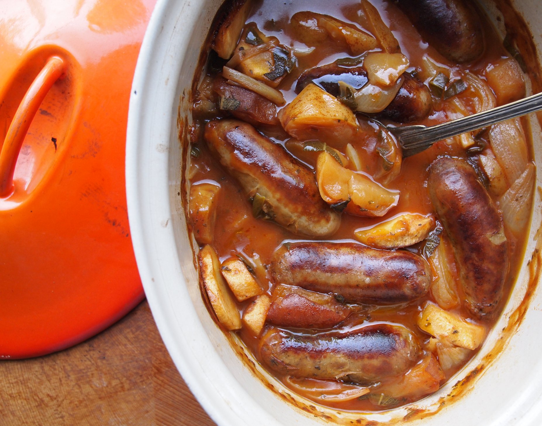 Tea: Sausage and Apple Casserole in Cider (Recipe below)