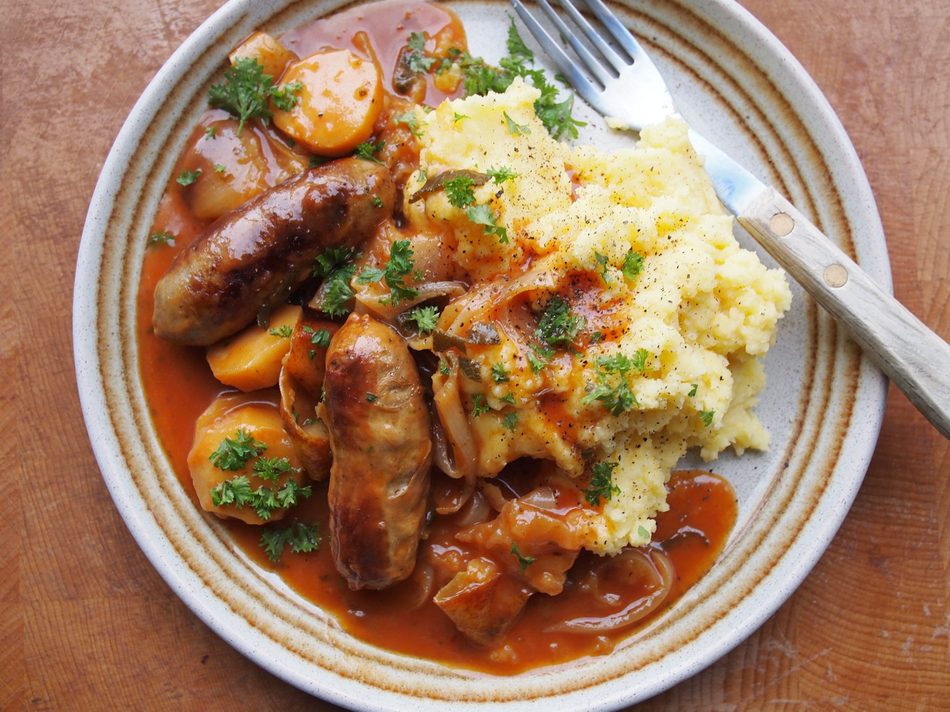 It’s been a funny week, as you all know I was living off WW2 rations last week and I have found it quite hard to get back into the swing of things since then! I enjoyed my week in the Wartime Kitchen and if any of you are interested in replicating the recipes at home, they are all here: Wartime Kitchen – Ration Book Cooking. It was a very humbling experience and when I came to plan my meals this week, I was mindful of just how times have changed when it comes to portion sizes and ingredients; so, I am trying to be just as frugal, which, will be great for my ongoing diet (which was paused last week) as well as my bank balance. One of my favourite autumn or winter meals is a good sausage casserole, and even with a small packet of sausages, a substitutional family meal can be made. I am a bit of a food snob when it comes to sausages, I only buy ones that are made with British meat, preferably made locally and that have a high meat content. In my opinion, it’s a false economy to buy cheap ones with a high ratio of bread meal, soya and all the other padding agents that are frequently added to those grey sorry-looking sausages.
