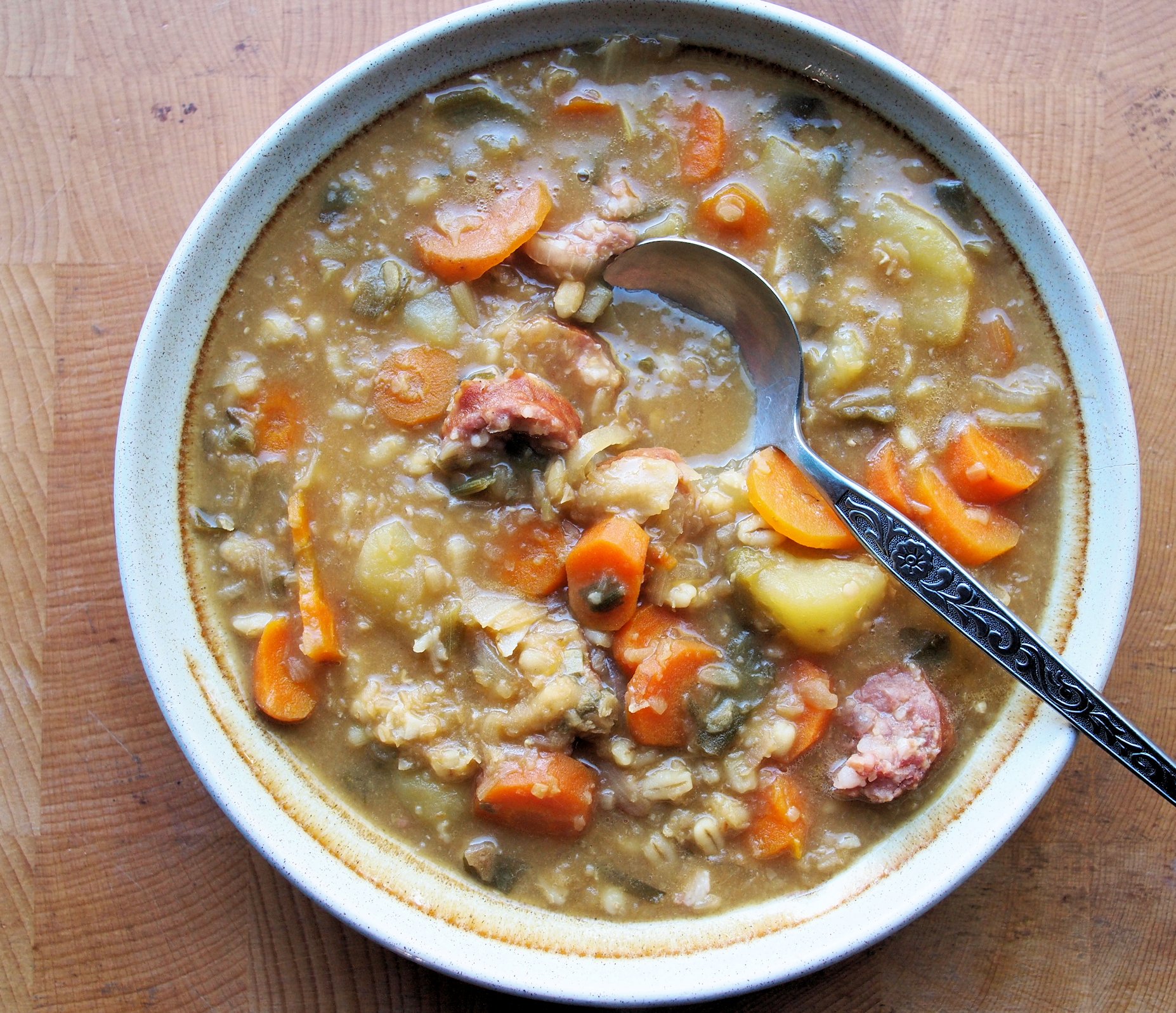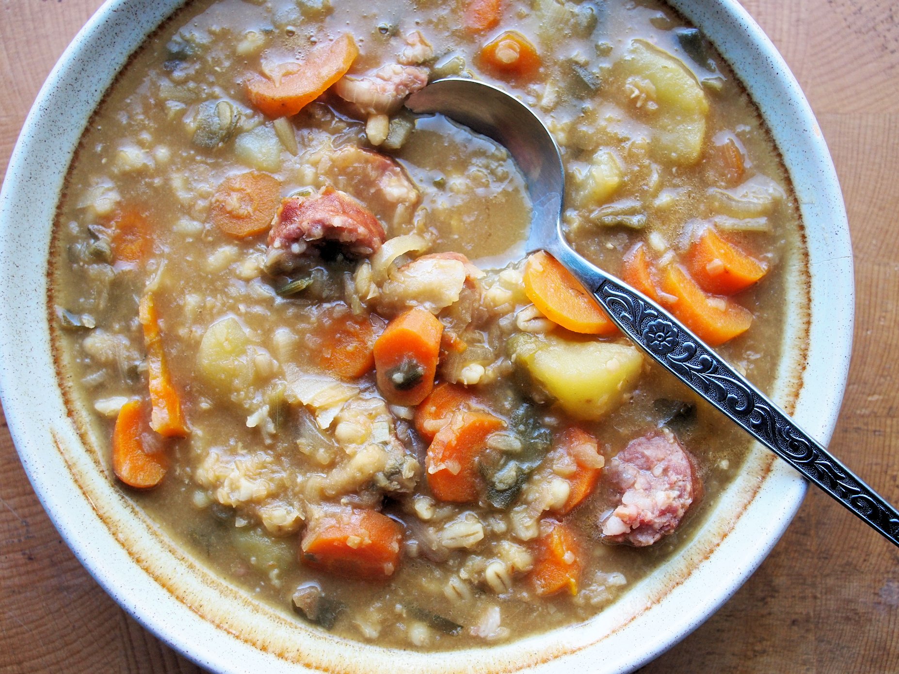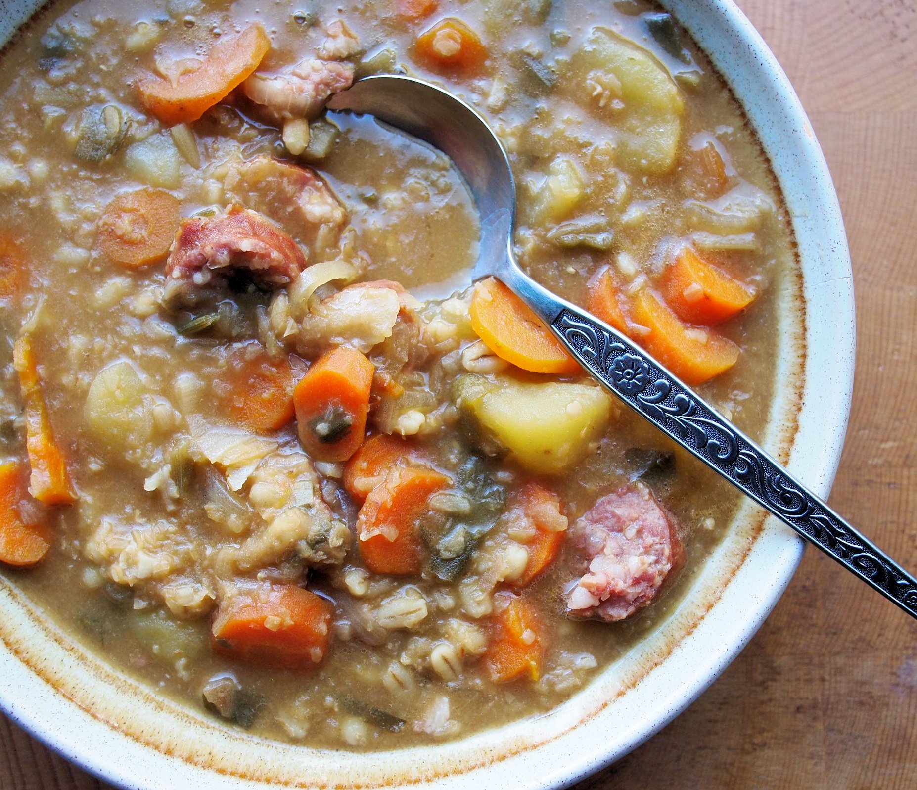 It IS only 500 calories for the whole amount sans sausage as the vegetables are very low in calories (except the spuds) and it is the pearl barley and lentils that make up most of the calories!