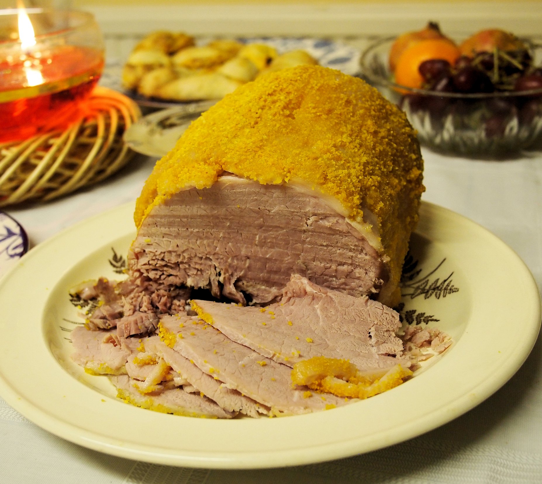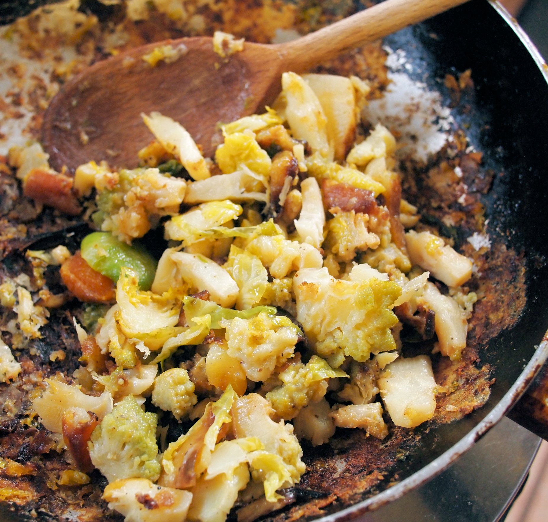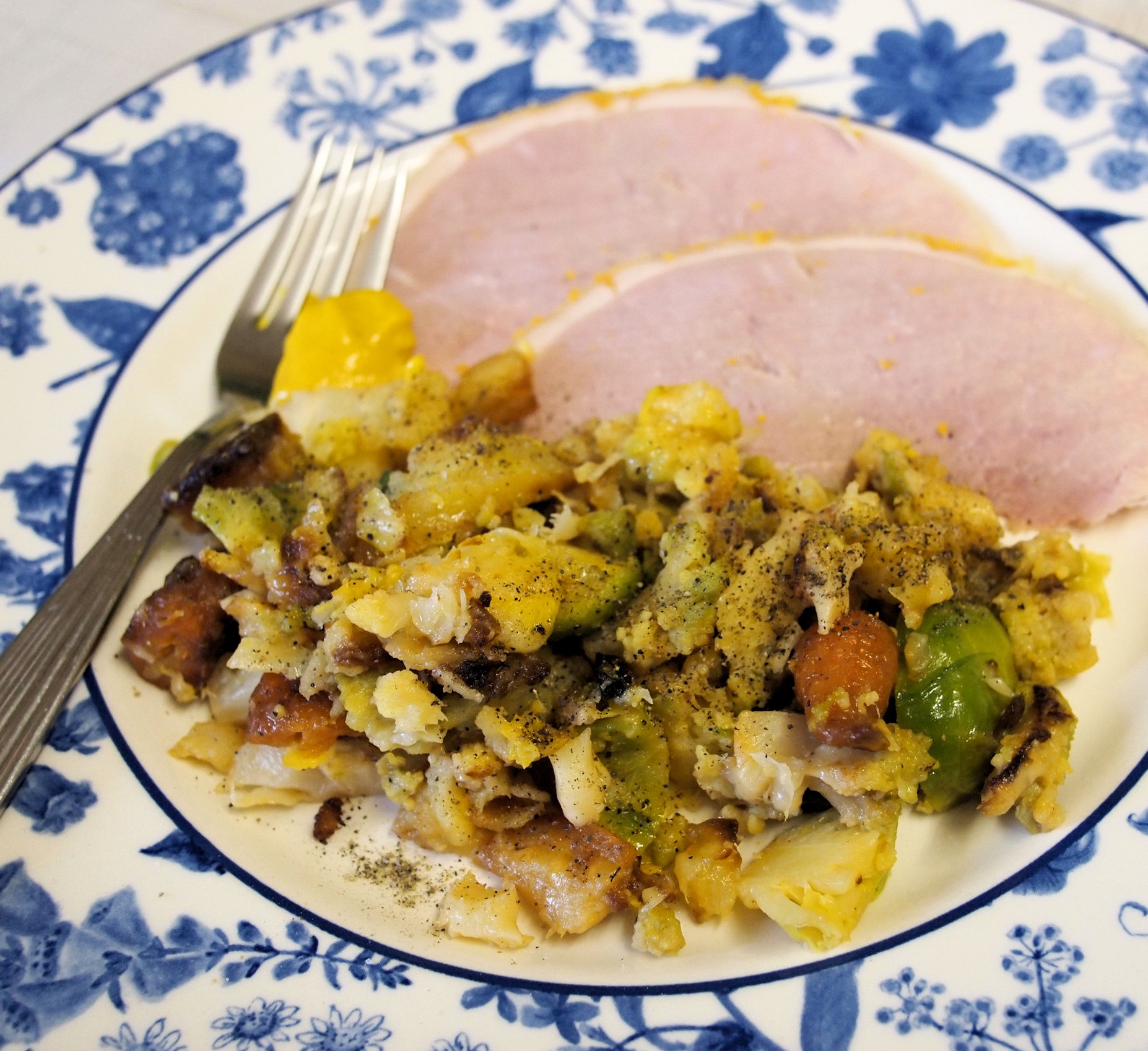 I am being very brave, I am showing you my “bubble and squeak” frying pan…..it’s old, battered and very much non-stick! It’s the best frying pan for bacon, eggs and all fry ups……and it is absolutely essential that there is a “crust” of fried vegetables left on the base of the pan, for “prising” off the crispy brown bits. I served this Boxing day feast with some slices of home-baked York Ham that I made for our Christmas Eve buffet and a goodly dollop of English mustard.