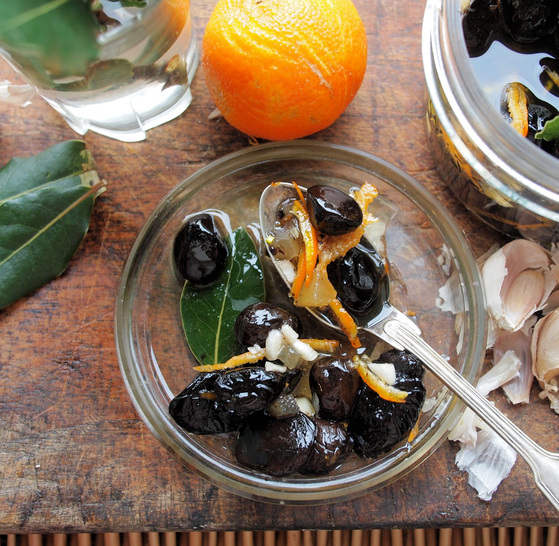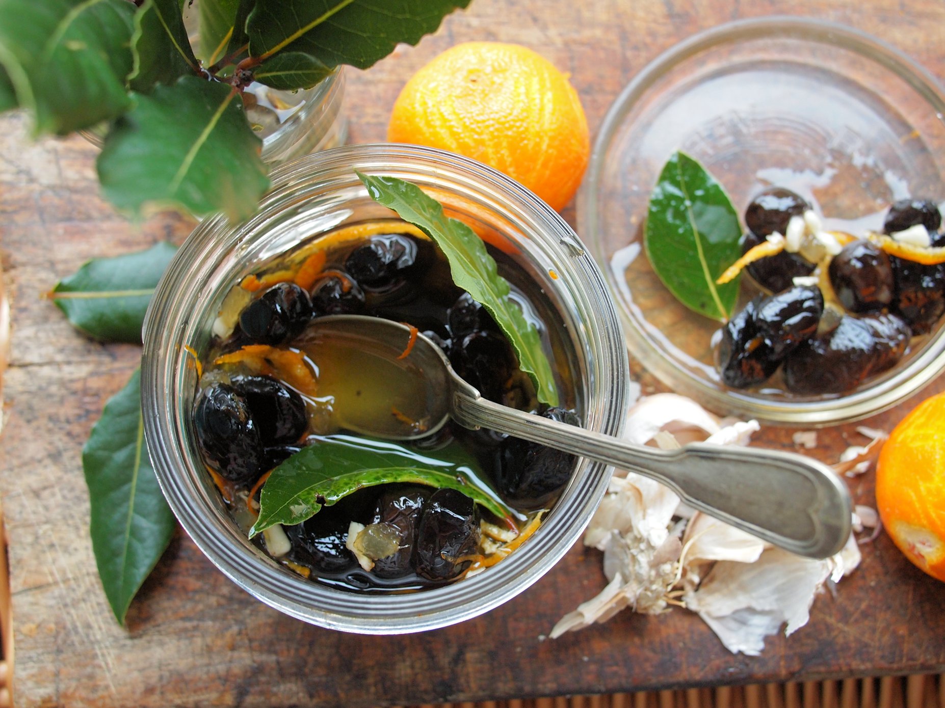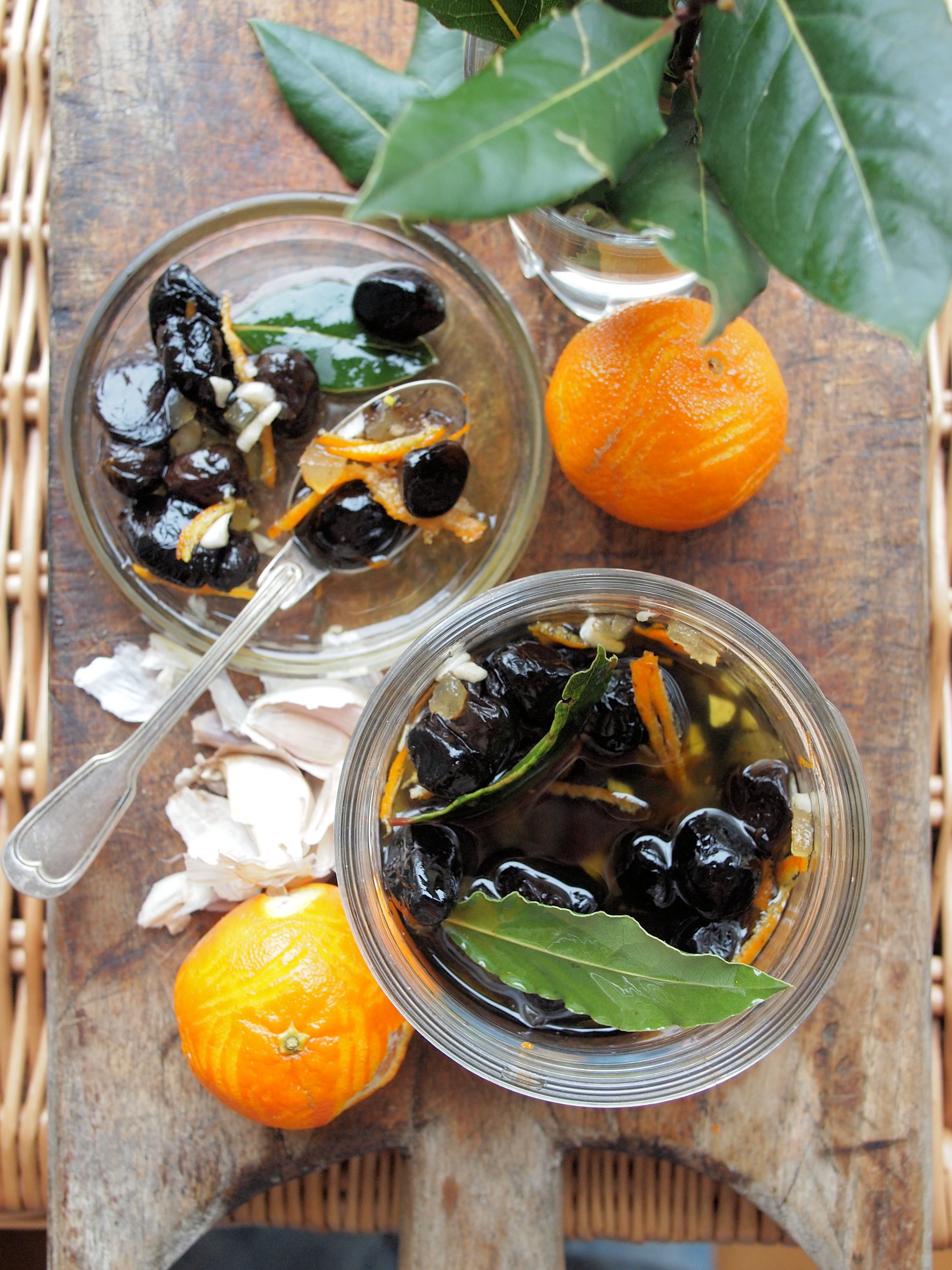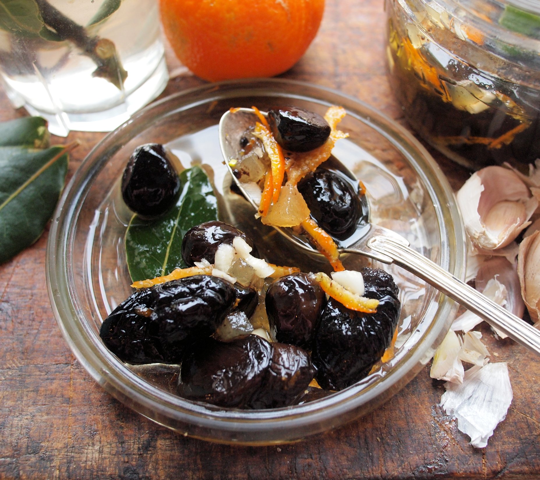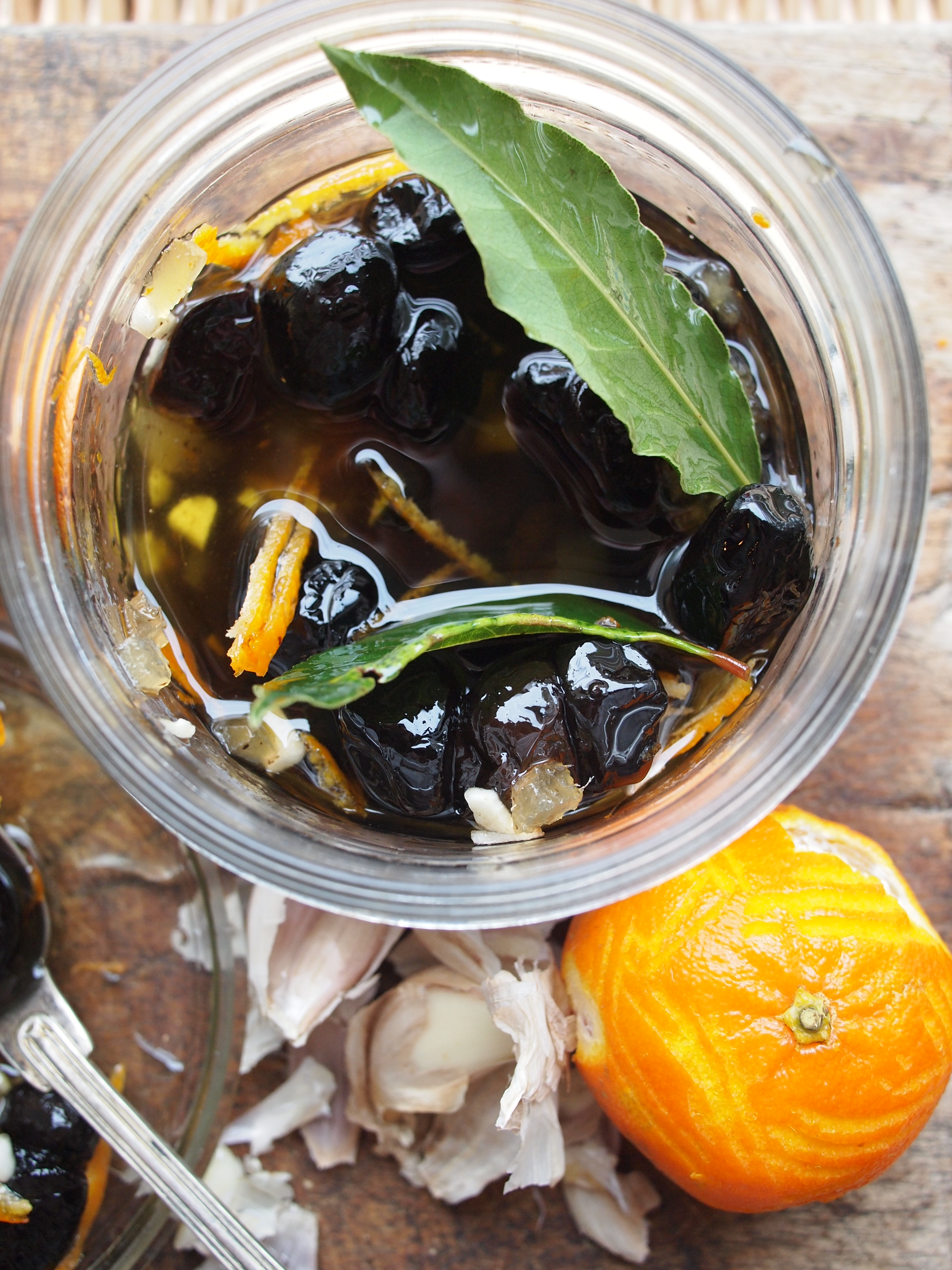 A colourful and tangy citrus marinade for black olives; the ginger and bay leaves add a a fabulous extra dimension to these olives, and they would make a perfect gift for a foodie friend.
