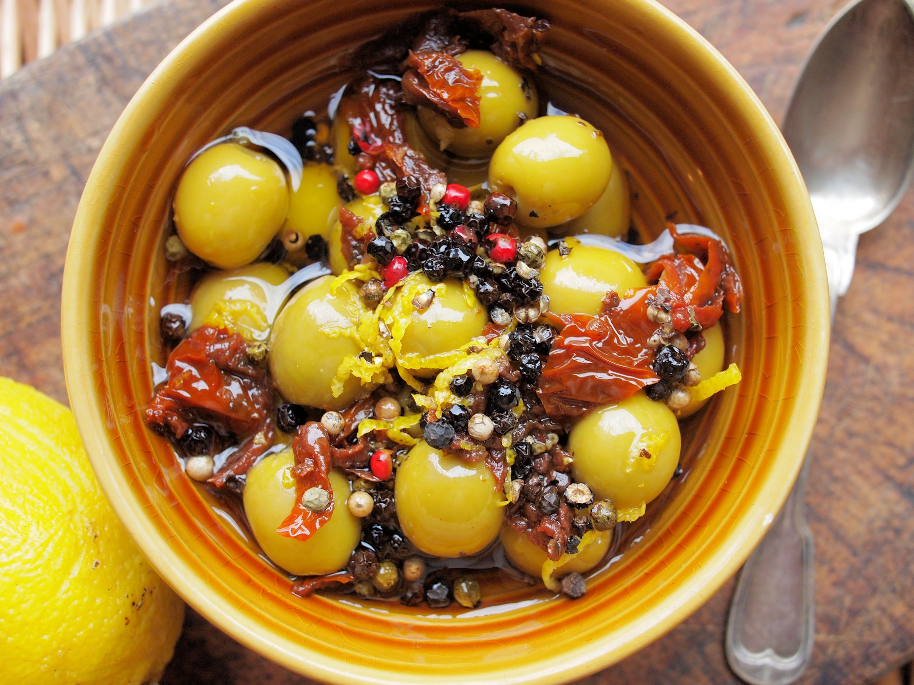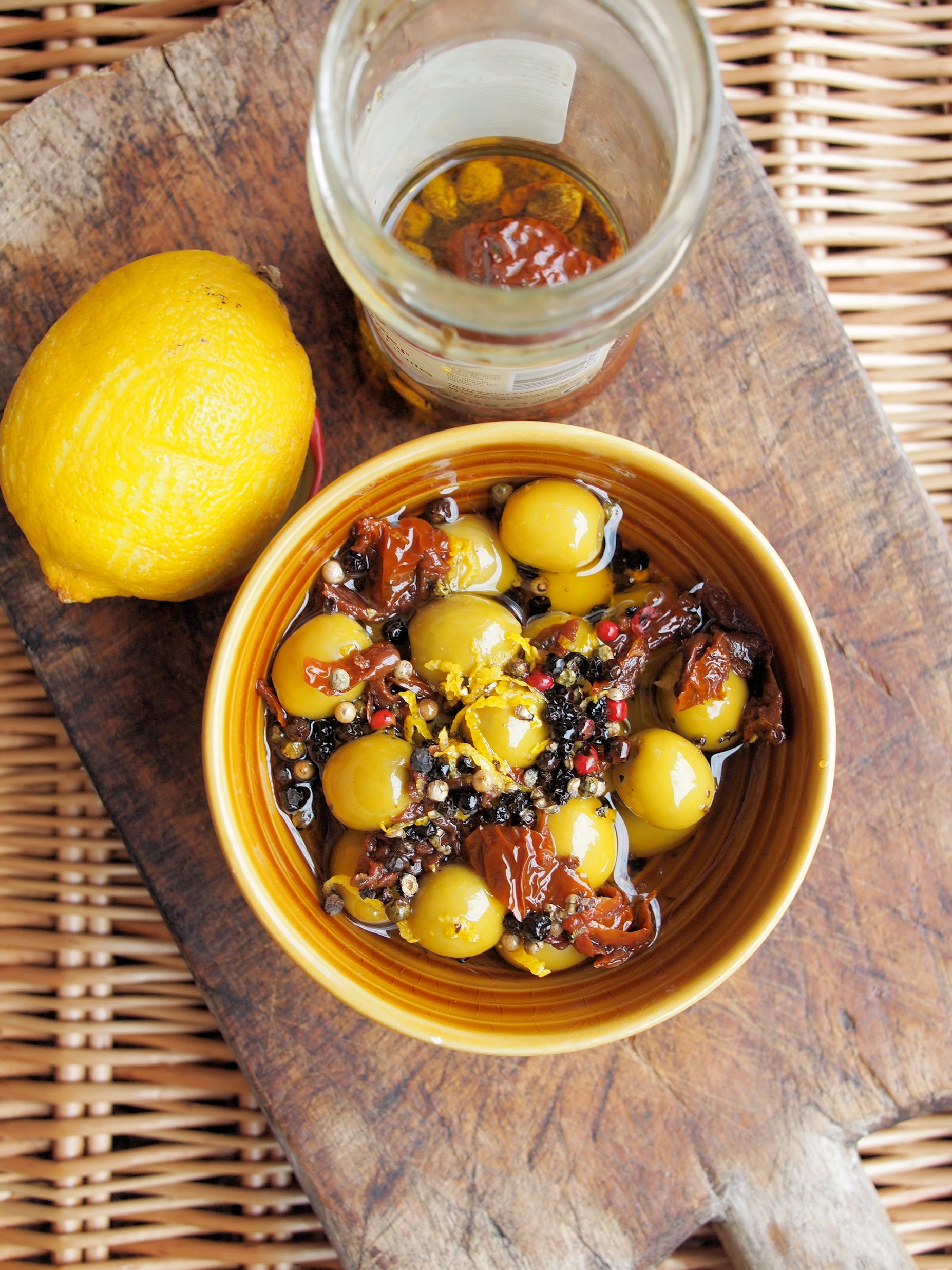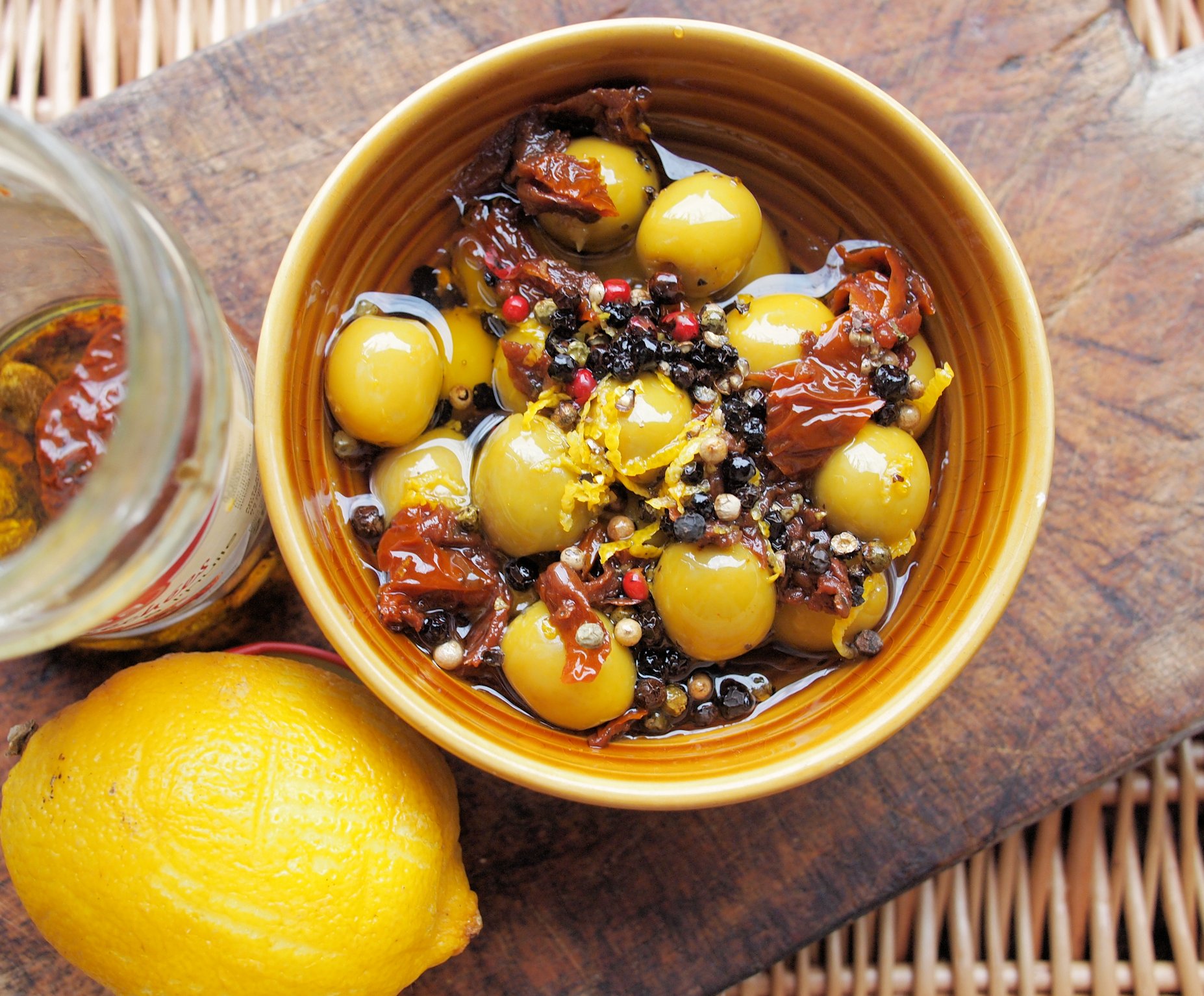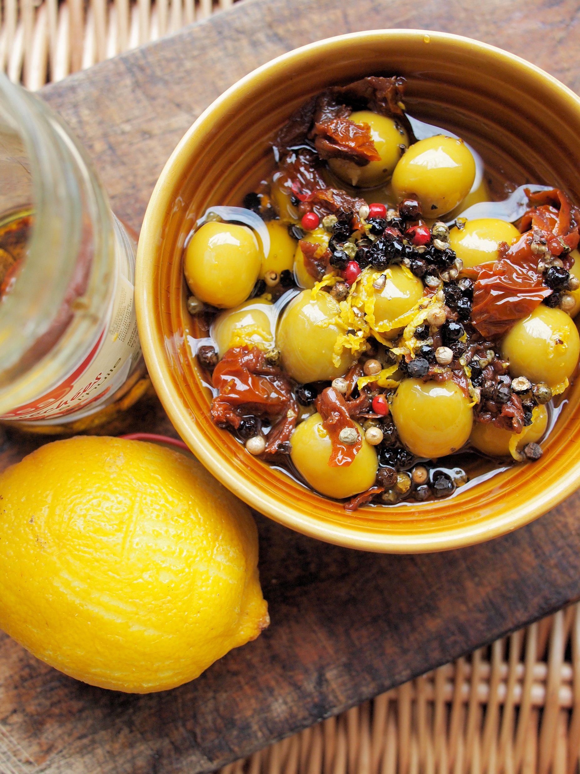 Next on my oily list for a special marinade was an idea for green olives; I drew on my years of living in Cyprus for this recipe and remember eating fresh green olives with lemon and crushed coriander seeds. So marinade number two was created, a zingy little number, Coriander, Lemon and Sun-Dried Tomato Marinade for Olives, perfect for green olives and using sun-dried tomatoes as the mystery guest. Along with the sun-dried tomatoes, I added some crushed coriander seeds, lemon zest and a handful of mixed peppercorns for an extra dimension, and for the tongue and the eye.