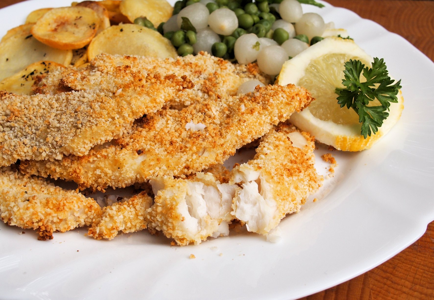 Dinner: Low-Calorie Haddock Goujons with Garlic Panko Crumb with peas = 260 calories