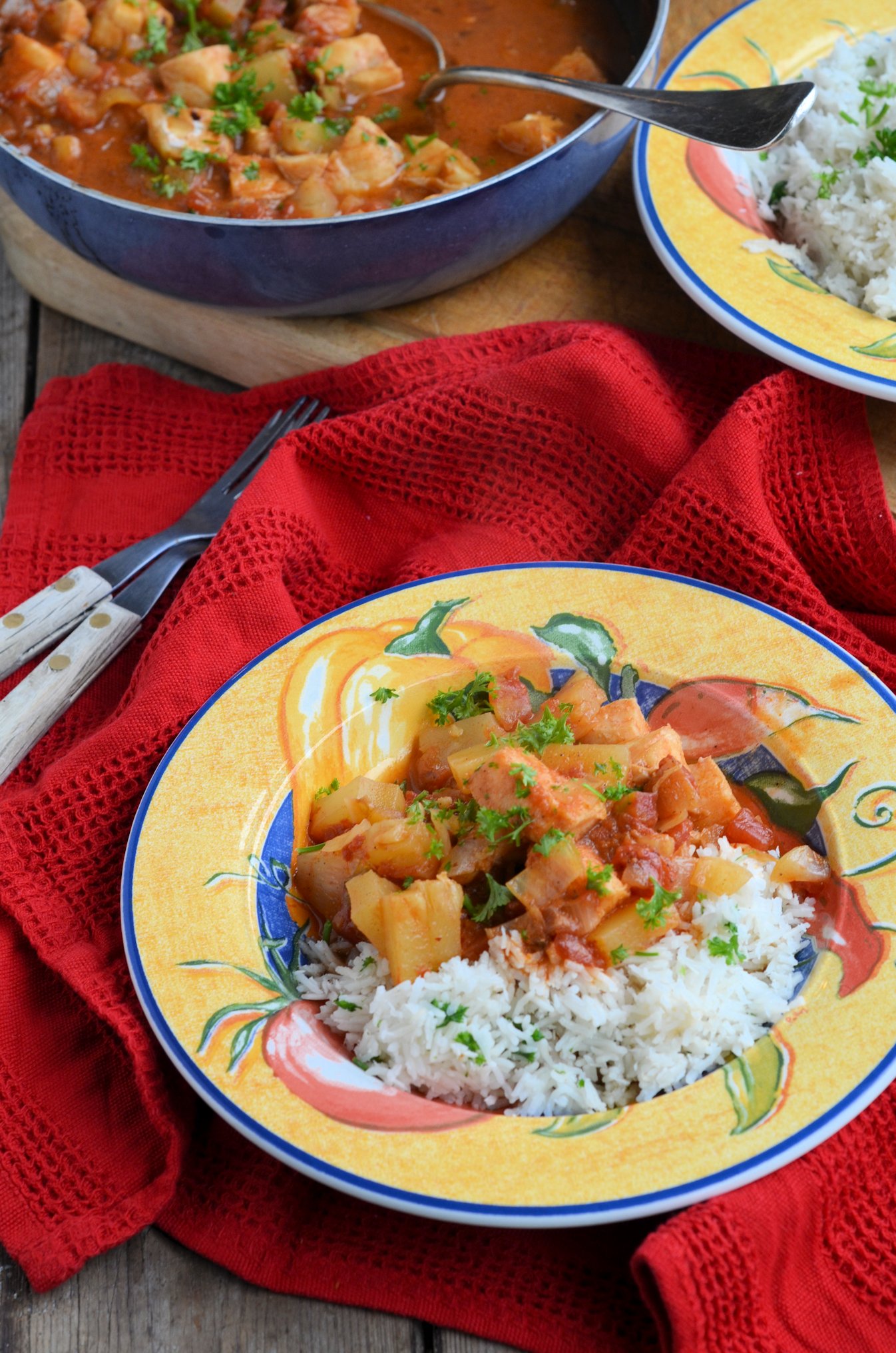 Step 3 | Stir in the pineapple chunks and the fish, season to taste with salt and freshly ground pepper and simmer for a further 8 to 10 minutes with the lid on. |