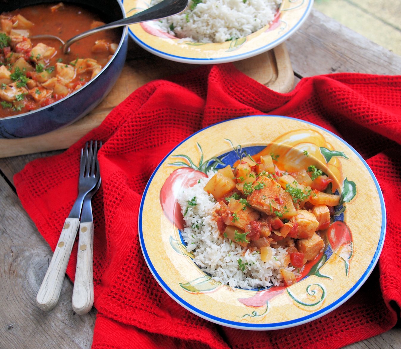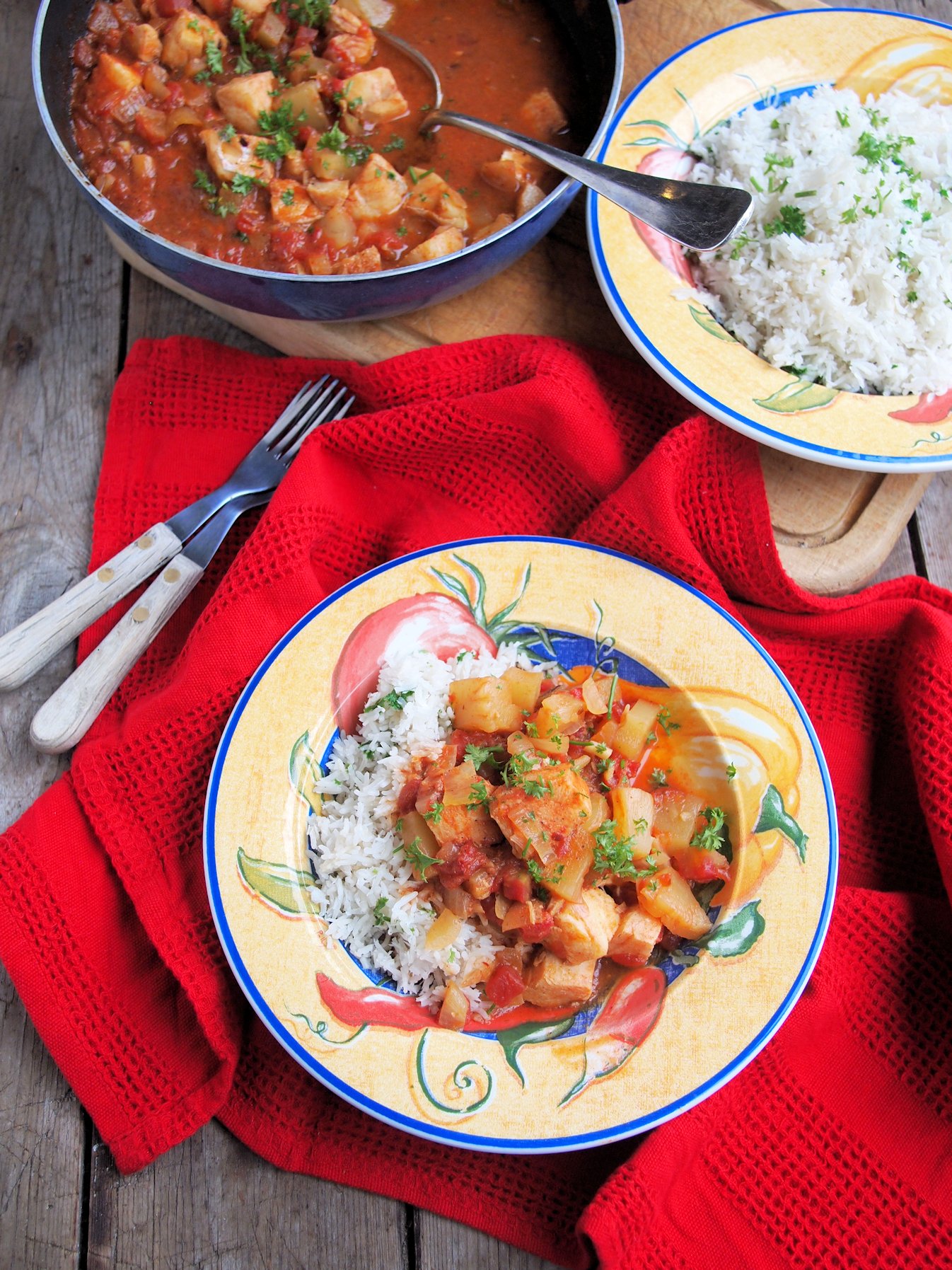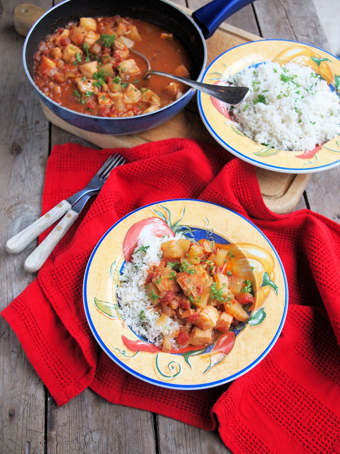 I hear lots of people talking about poverty, yes, things are tough, but are they any tougher than they were during the second world war, or at the turn of the century? I don’t think so! It’s a fact that a standard packet (450g) of locally reared British beef will feed a family of four for two meals, if the meals are prepared at home; we all tend to eat far too much nowadays, and our portion (and plate) sizes have grown, along with obesity. It’s the cheap, ready-meal marketing policy that has led to this whole fiasco, as supermarkets and companies fight for the economy end of the market with scant regard for the quality and provenance of the ingredients. But, I digress from today’s post…….and it is probably time I got off my soap box and shared my recipe for today with you all! My Spicy Fish Creole with Coconut Lime Rice for Fish on Friday is a bit of a culinary triumph! It’s very filling, uses fresh Scottish fish, is beautifully spiced and is served with fruity and aromatic coconut lime rice. The recipe feeds four people and is only 350 calories per portion, and that includes the rice too. If you want, you can freeze the remaining portions for another low-calorie fast day, for those of you who are following the 5:2 diet, but it’s my guess that once the family has seen it, they will also want to eat it!