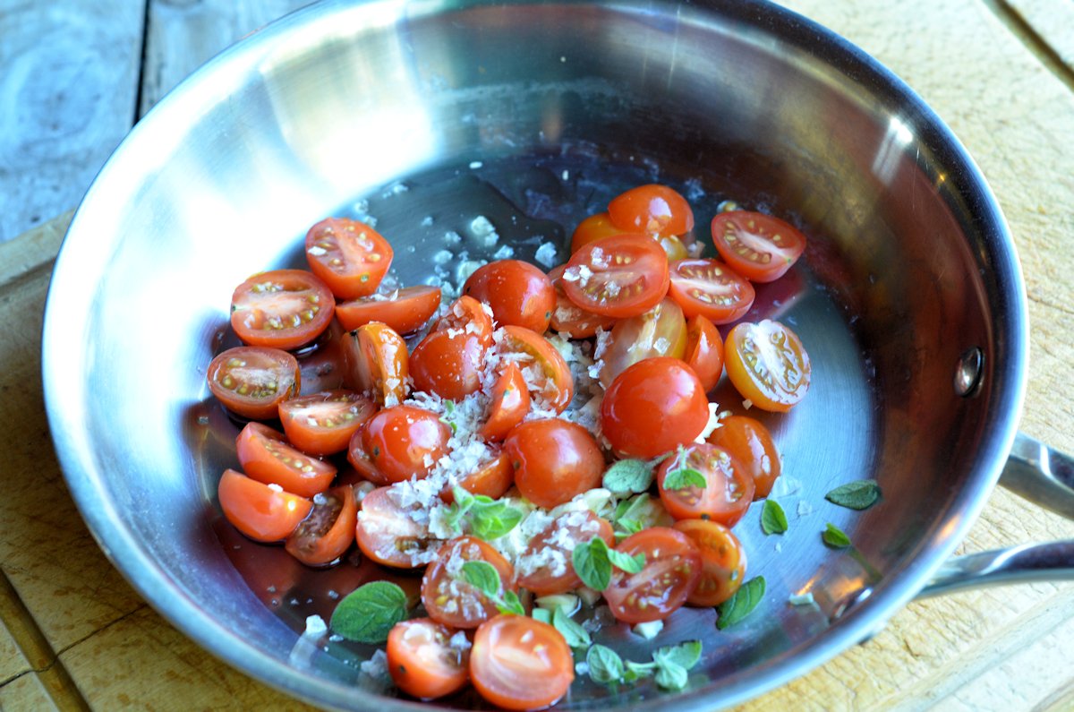 | Step 1 | Heat up the oil in a frying pan and add the garlic, tomatoes, oregano leaves and smoked sea salt. Gently fry over a low heat until the garlic is cooked and soft, and the tomatoes are soft. |