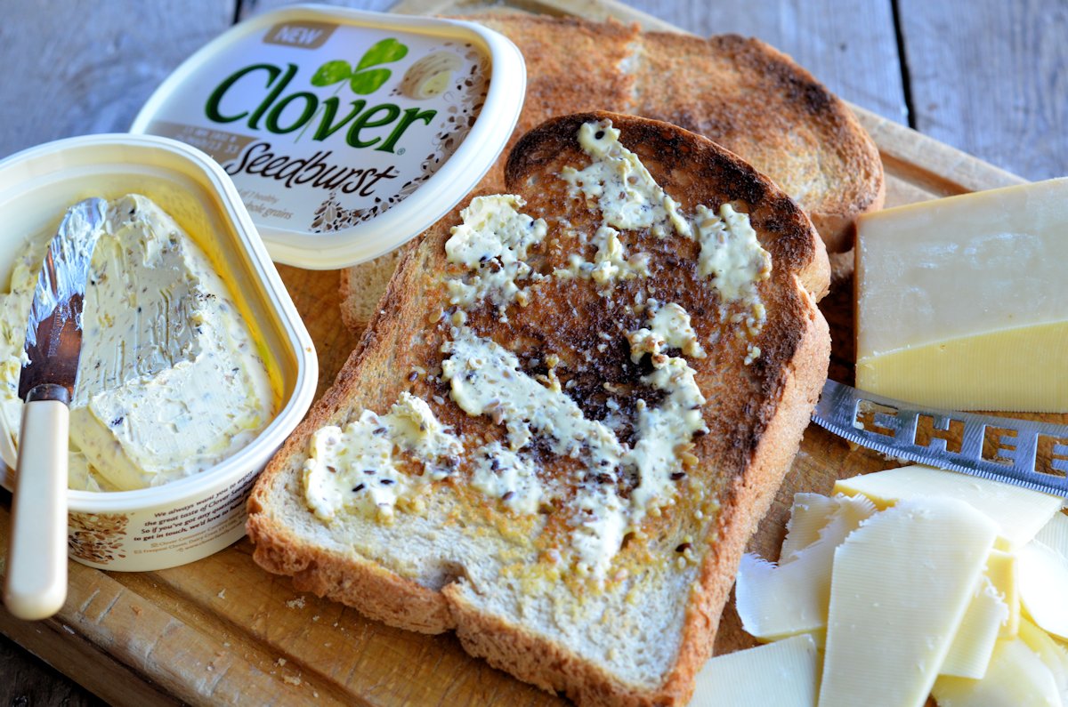 | Step 2 | Meanwhile, toast the bread, on both sides and whilst it is still hot spread butter or the spread of your choice over it. (I used Clover Seedburst) |