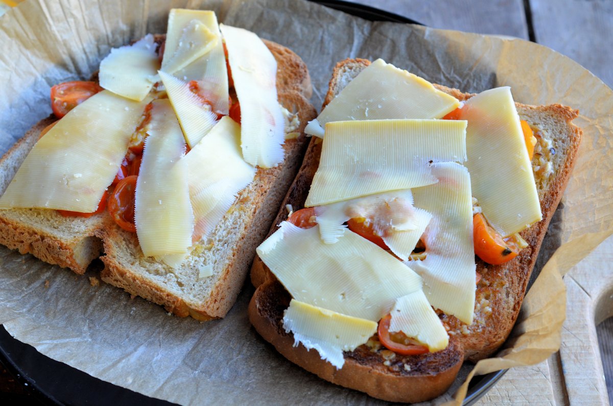 | Step 3 | Place the two slices of buttered toast on a lined baking tray and then spoon over the garlic and tomato mixture. Arrange the slices of smoked cheese over the top, making sure they cover the toast right up the edges, and then place under a grill and cook until the cheese has melted and is bubbling. |