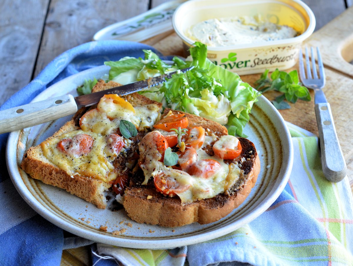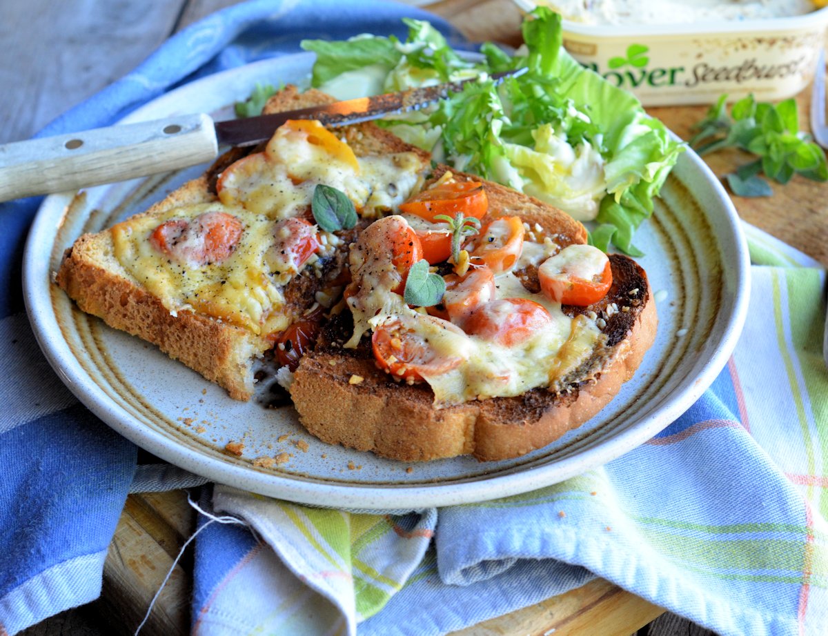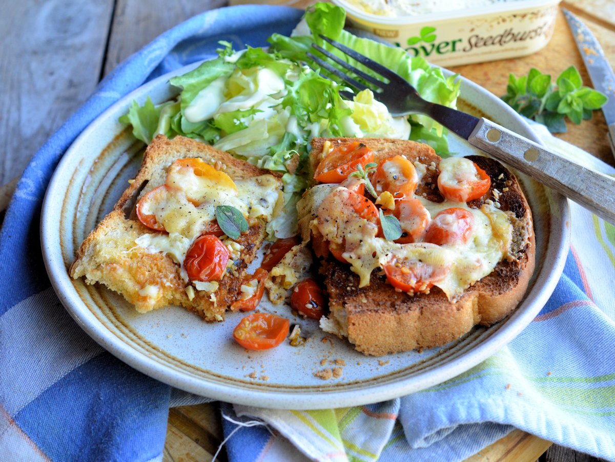 A delectable twist on the usual Welsh Rarebit, this recipe is easy to assemble and cook, and is on the table in 20 minutes. Smoked sea salt is added to cherry tomatoes and garlic, which makes for a tasty base under the cheese, and the oregano adds a wonderful herbal flavour. I used Clover Seedburst to spread on my toast, but, butter can also be used.