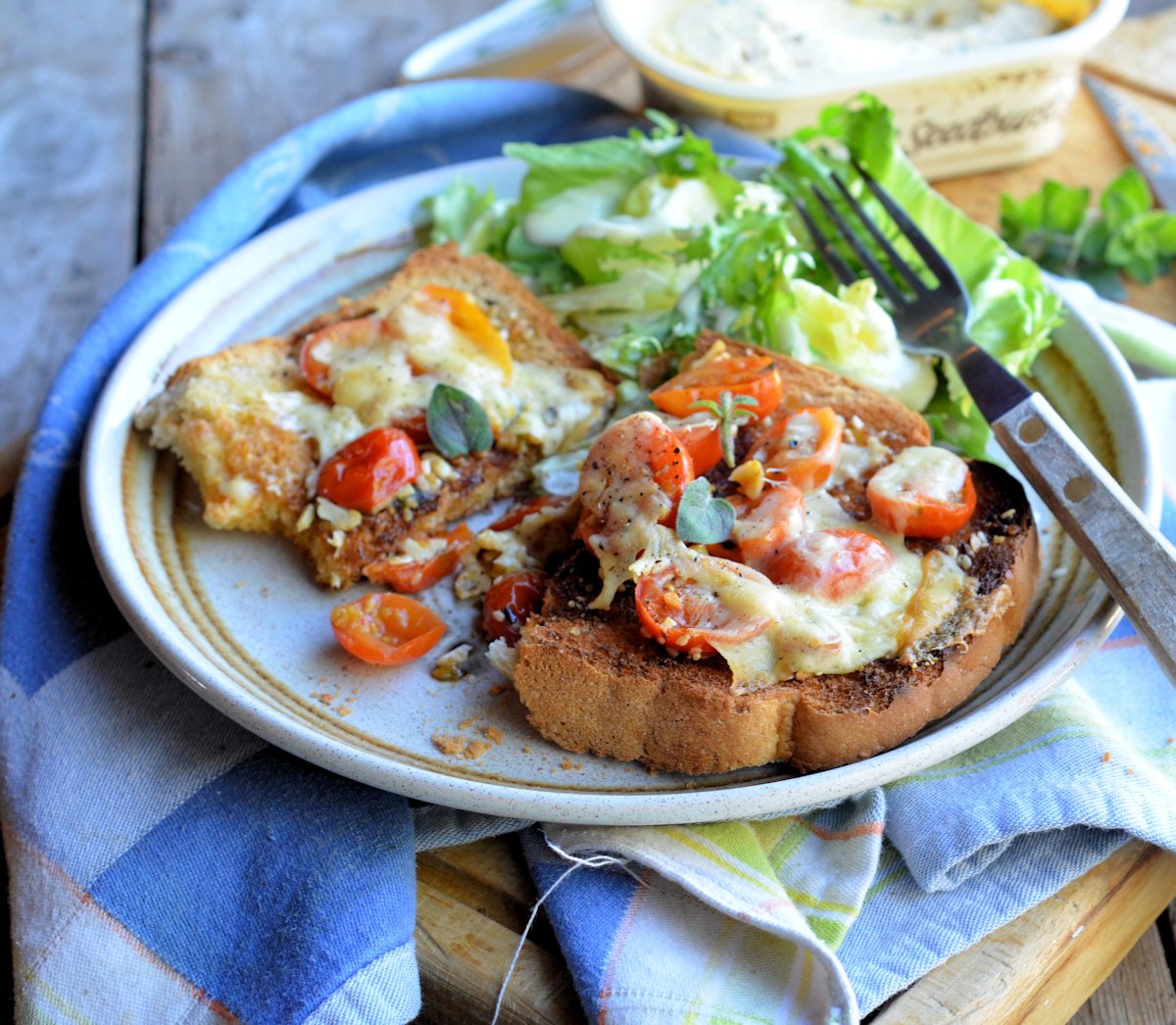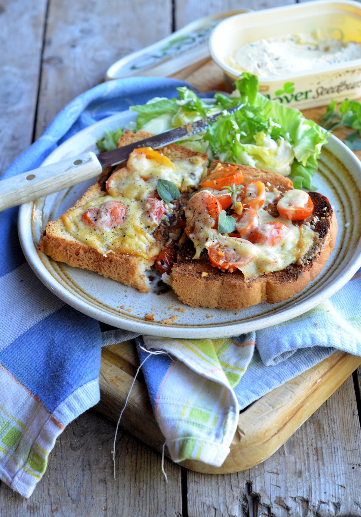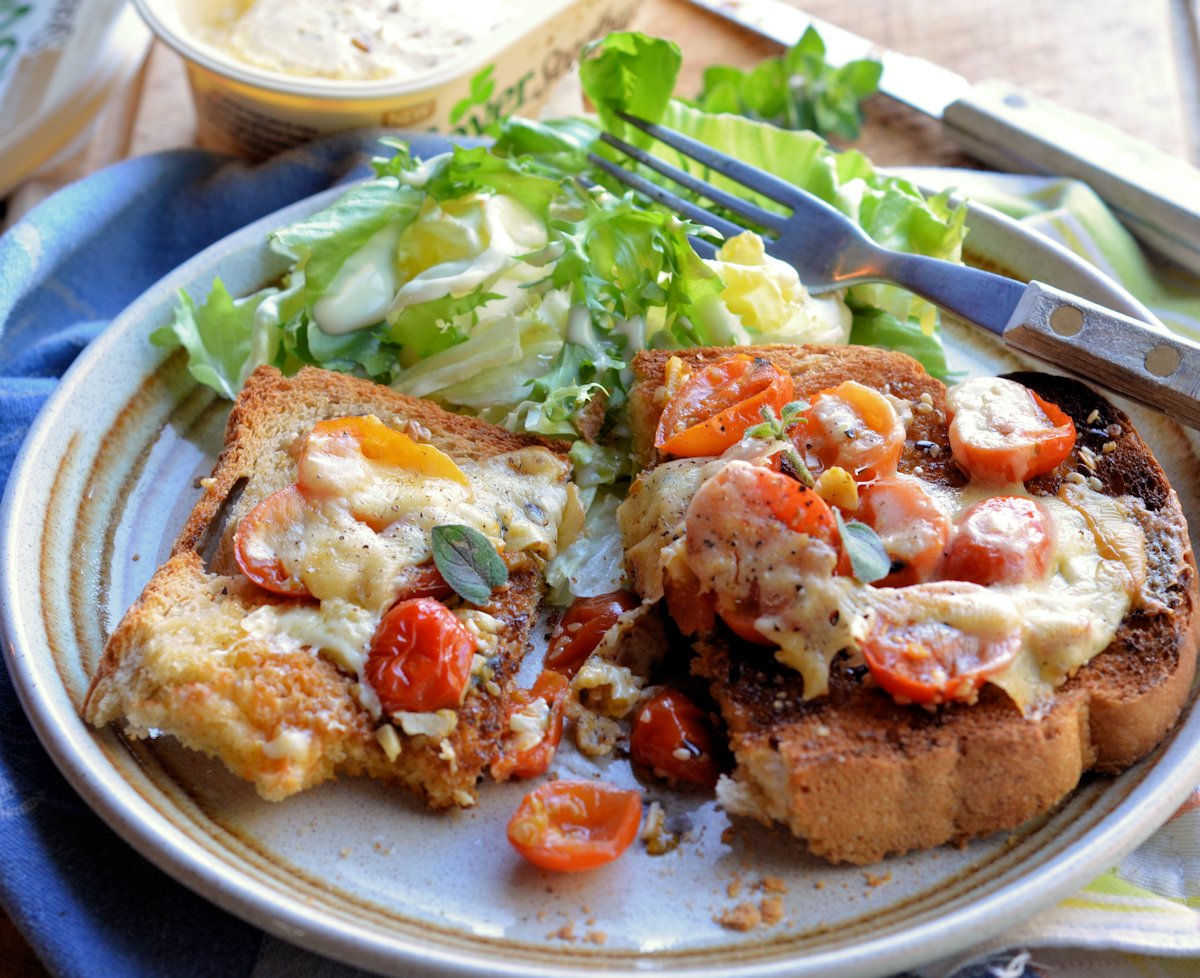 A delectable twist on the usual Welsh Rarebit, this recipe is easy to assemble and cook, and is on the table in 20 minutes. Smoked sea salt is added to cherry tomatoes and garlic, which makes for a tasty base under the cheese, and the oregano adds a wonderful herbal flavour. I used Clover Seedburst to spread on my toast, but, butter can also be used.
