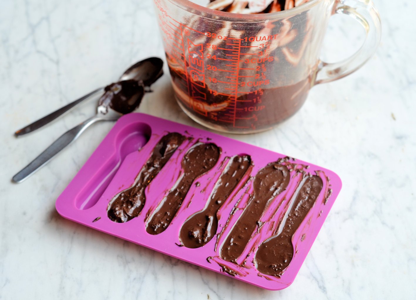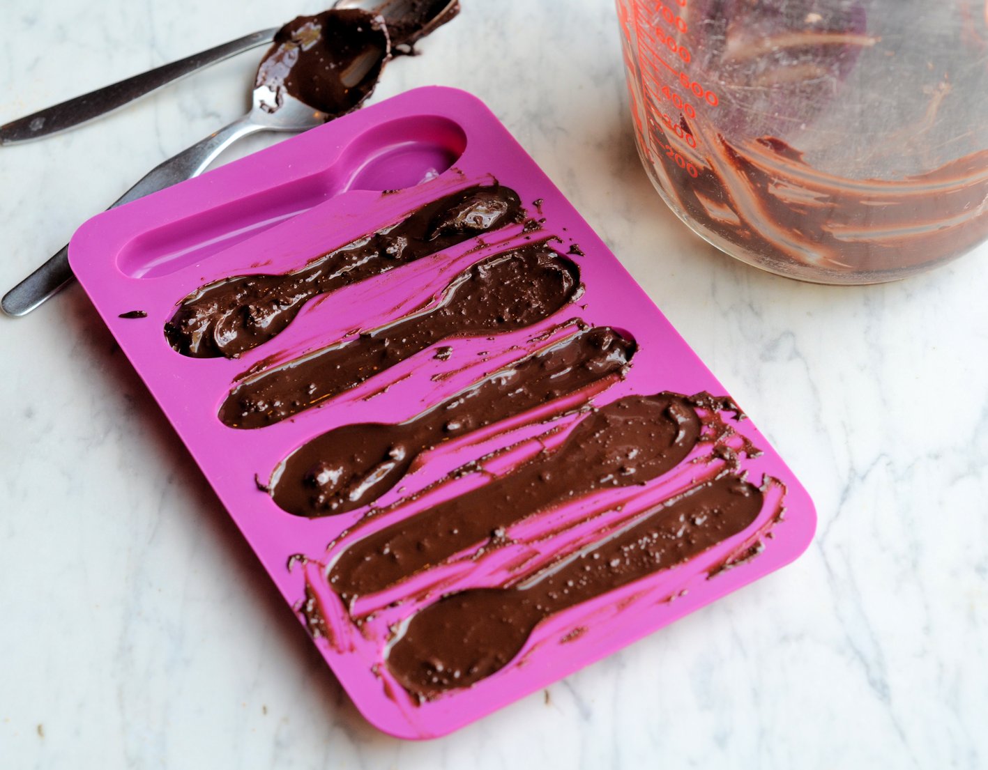 Pour or spoon the chocolate into spoon moulds, packing and smoothing it down to eliminate air bubbles. Put the chocolate filled mould somewhere cold such as the fridge, and allow to set. It takes between 15 and 30 minutes to set.