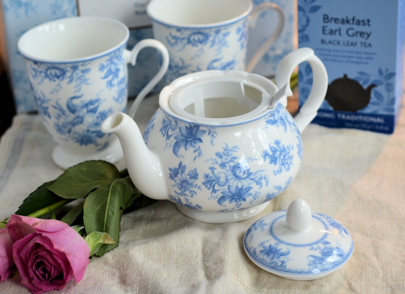 The set was BEAUTIFULLY presented in a box, and was safely packed for transit. The tea set is made in England, a HUGE plus for me, and is fine bone china. The quality of the set was superb, with a nice balanced feel to the mugs and the teapot and a crisp clear pattern of blue chintz, which is a classic pattern and makes any tea time table look well dressed! I LOVED the tea filter basket that sits inside the teapot, and means that you can make PROPER tea with loose tea and not have to worry about a tea strainer that sits over a tea-cup, or in this case, a mug. The mugs are an elegant shape and are easy to hold and drink from, even my husband whose hands are bugger than mine was happy with the handle. The teapot makes enough tea for two mugs, and although we are avid tea drinkers, this was perfect for elevenses or afternoon tea; we tend to make a big Brown Betty teapot of tea first thing in the morning that makes 6 cups! The tea filter basket is easy to remove and also easy to clean. Whittard of Chelsea is known for its tea and coffee blends, and the Breakfast Earl Grey loose tea was well-blended with a distinct and yet subtle bergamot orange flavour. As you can see from my photos, this is a truly beautiful ENGLISH made tea set that I recommend to all my readers with no hesitation. I give this lovely tea set a Lavender and Lovage score of 5 out of 5 – it will make a WONDERFUL gift for any mum on mother’s day, as well as for birthdays, anniversaries or just because!
