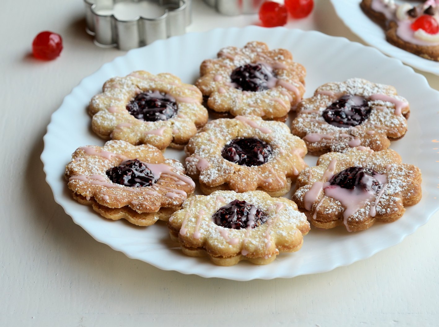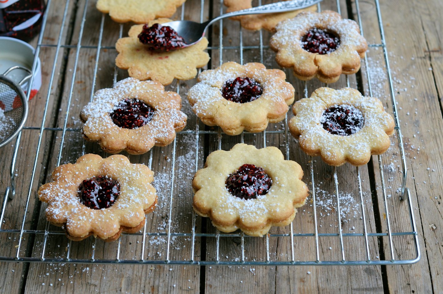 Step 5 | Bake the biscuits for 20 to 25 minutes or until firm and just golden. Remove them from the oven and place them on a cooling rack to cool completely – being careful when you take them off the baking tray as they are fragile and they can crack. Place a teaspoon of jam onto the centre of each biscuit that does NOT have the circle stamped out. Sandwich all the biscuits together with the jam. OPTIONAL: Sprinkle with icing sugar or drizzle with icing. |