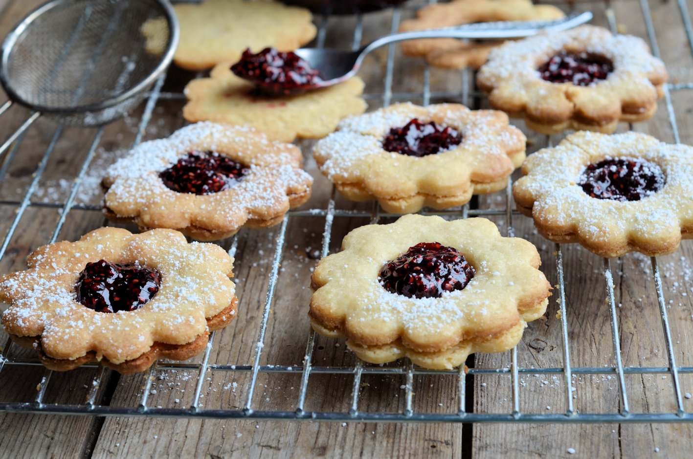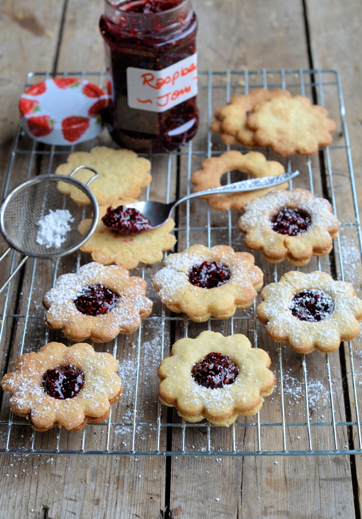 A buttery biscuit that reveals its jam filling, a jammie dodger is a thing of sublime beauty and a treat for the taste buds; it’s buttery and crumbly biscuit is sandwiched together with a sort of sticky and almost chewy jam filling, that stretches as you bite in to it and provides moments of joy……I may be waxing lyrical but I DO love a good jammie dodger biscuit, especially with a cup of tea! So, why bother to make them, as there is a commercial biscuit factory that makes them so well already? Well, it’s because no matter how delicious and tasty these wee raspberry rascals are when liberated from their gaily coloured packet, home-made ones are so much better and are fun to make too. My recipe is a simple egg enriched shortbread, fragrant with real vanilla extract and sandwiched together with home-made ruby-red raspberry jam, made with the raspberries from the bottom of the garden.