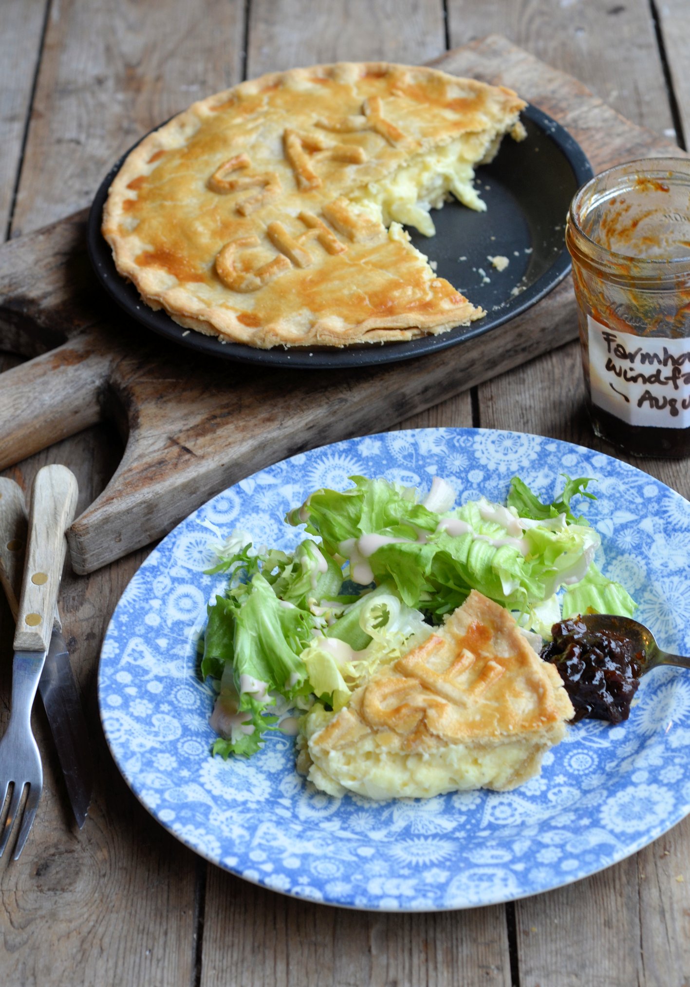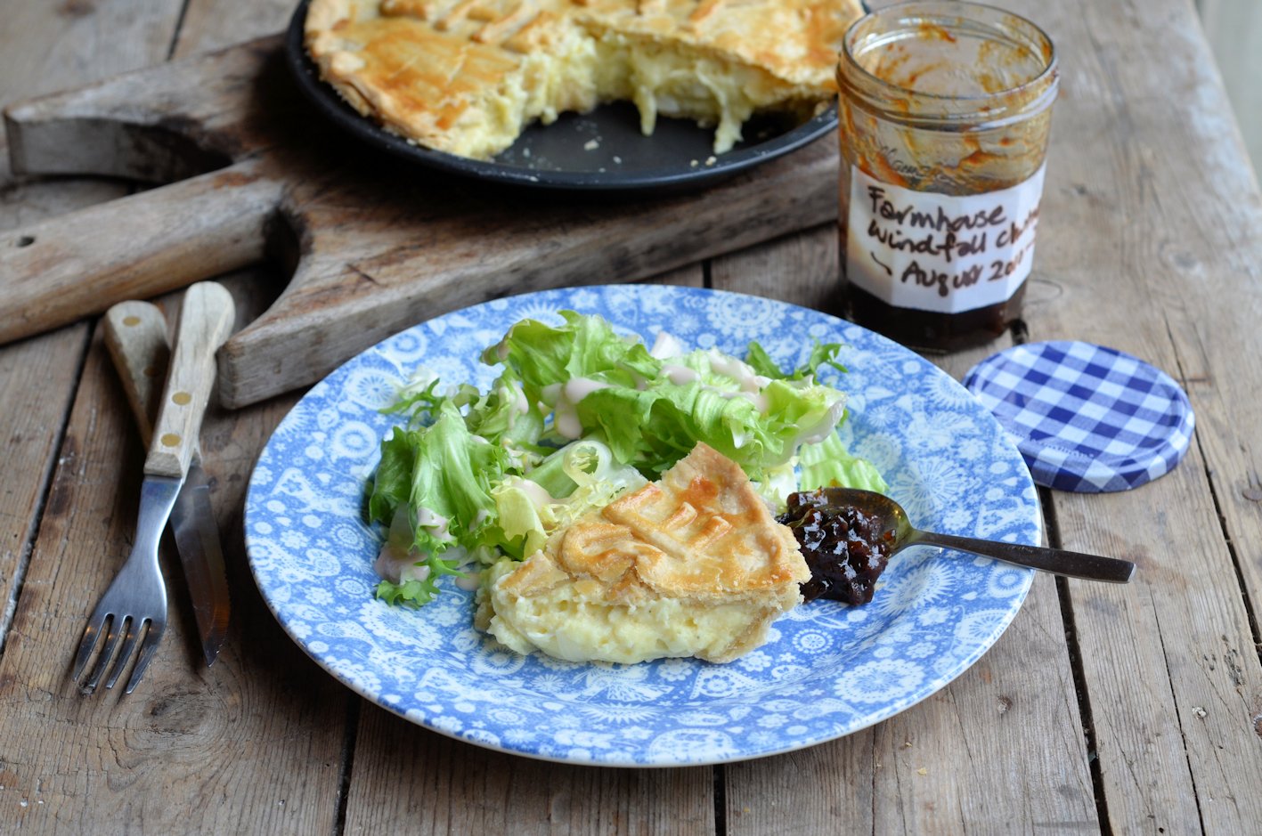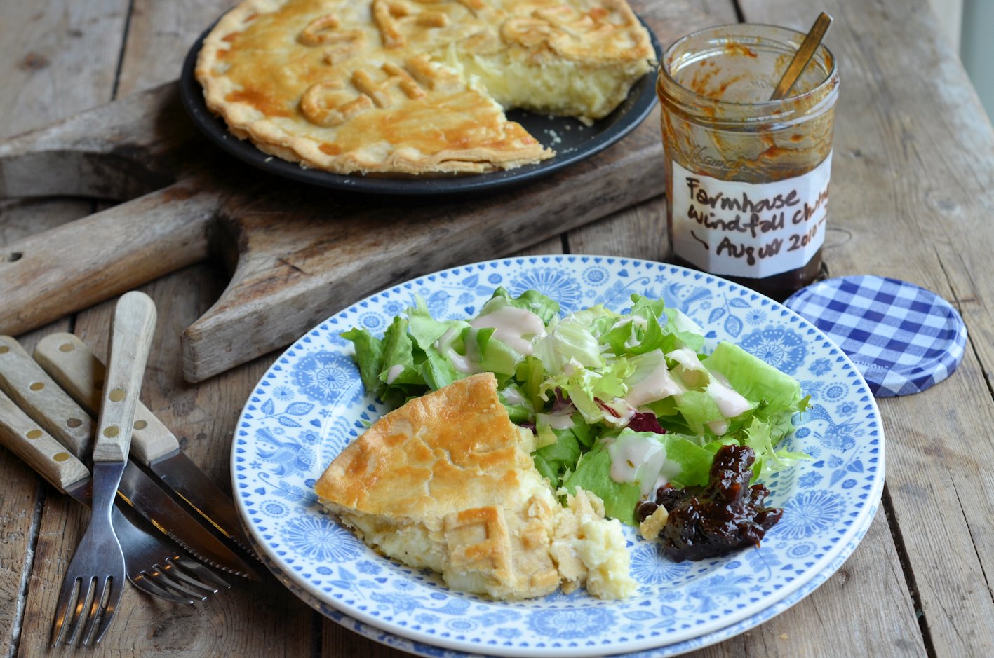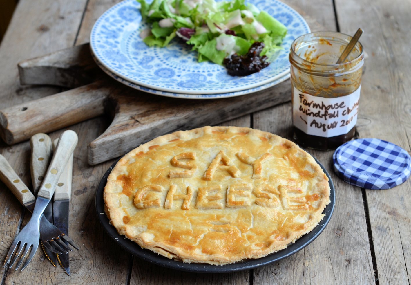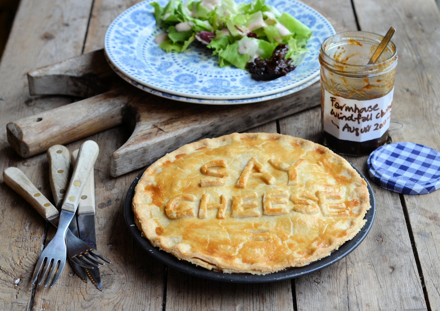 I served my “Say Cheese” pie with some fresh salad as well as some home-made Farmhouse Windfall Chutney that I made a couple of years ago; it’s wonderfully mellow now with spiced plum and pear flavours running through it, and I will share the recipe later on this year. You might have noticed the lovely blue dinner plates, well they are part of a wonderful 70 piece dinner, tea and breakfast service I received this week from Churchill China, with whom I will be working with from now on; the pattern is called Penzance, and I will be writing a full post all about my partnership with Churchill China this weekend.