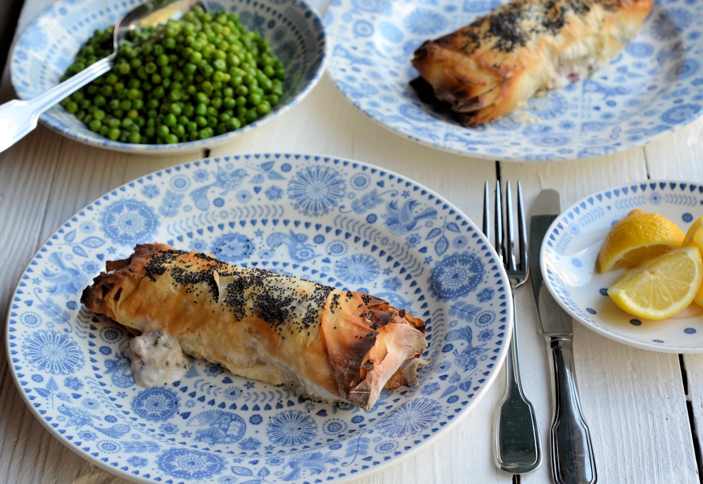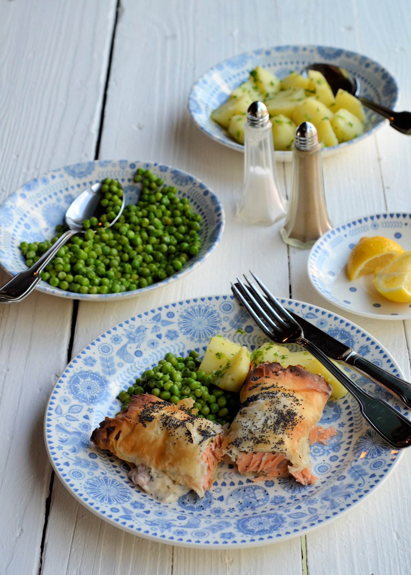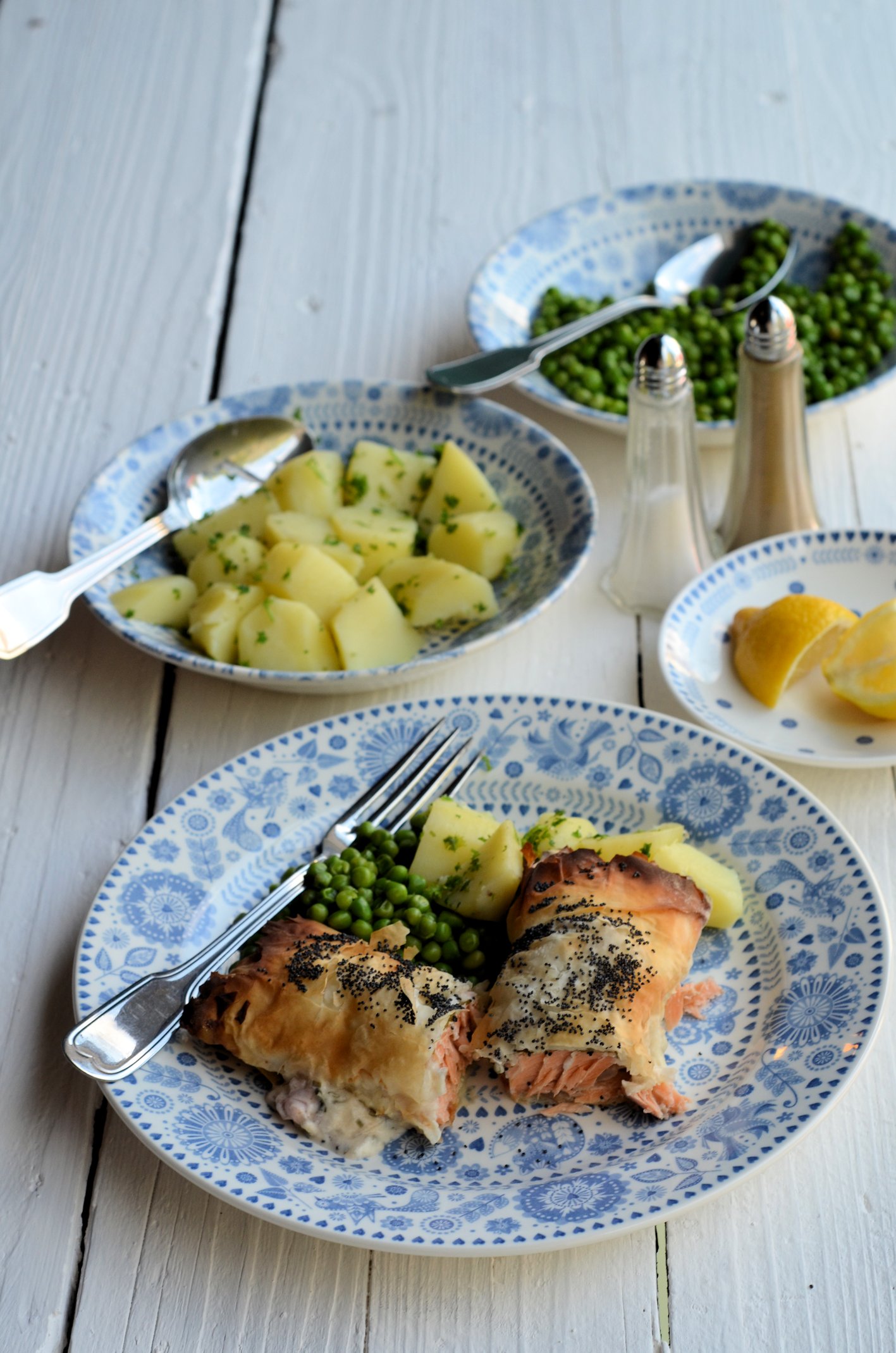 What a gorgeous recipe! You often find shortcrust or puff pastry with salmon but I always find it a bit much – salmon is quite substantial as it is. So the idea of the light, crisp filo pastry is fantastic, just perfect. And tinned salmon sandwiches were always our Sunday tea too – the malt vinegar is essential! My mum still makes these sandwiches for me now and I have to admit, I love them!