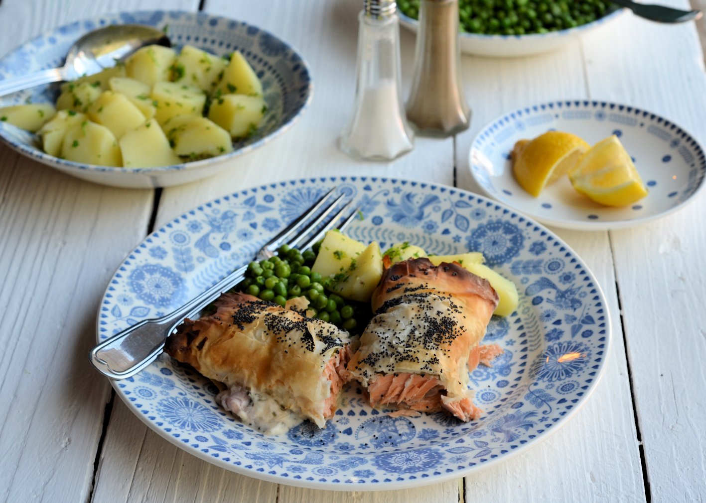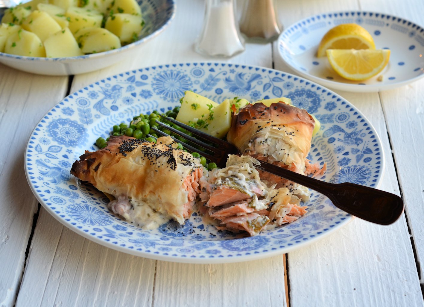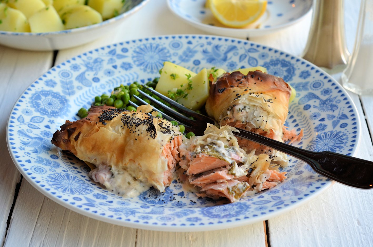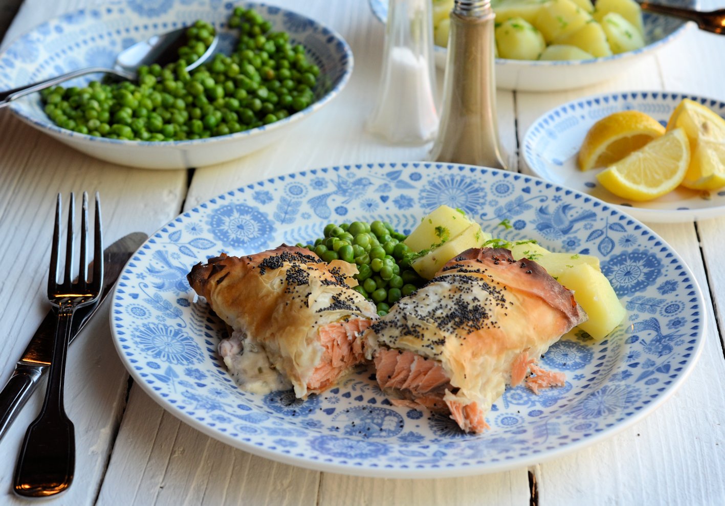 What a gorgeous recipe! You often find shortcrust or puff pastry with salmon but I always find it a bit much – salmon is quite substantial as it is. So the idea of the light, crisp filo pastry is fantastic, just perfect. And tinned salmon sandwiches were always our Sunday tea too – the malt vinegar is essential! My mum still makes these sandwiches for me now and I have to admit, I love them!