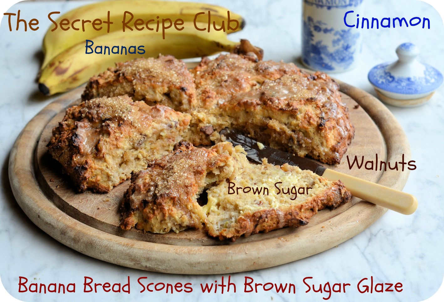 I know I say this will alarming predictability, but where has the month flown too? It really does seem like only yesterday that I was sharing my last Secret Recipe post, which was for some amazing Brown Butter Carrot and Orange Muffins; and here I am one month later with my latest recipe and secret blog partner. This month I was given the lovely Avril’s blog, she writes over at Baking and Creating with Avril, and as usual I was spoilt for choice when it came to choosing a recipe. But, there was one recipe that leapt out almost straight away, and being a bit of a scone addict it was easy to choose in the end. The recipe that caught my eye was for Banana Bread Scones with Brown Sugar Glaze – I mean, banana bread in a scone?! NO contest!