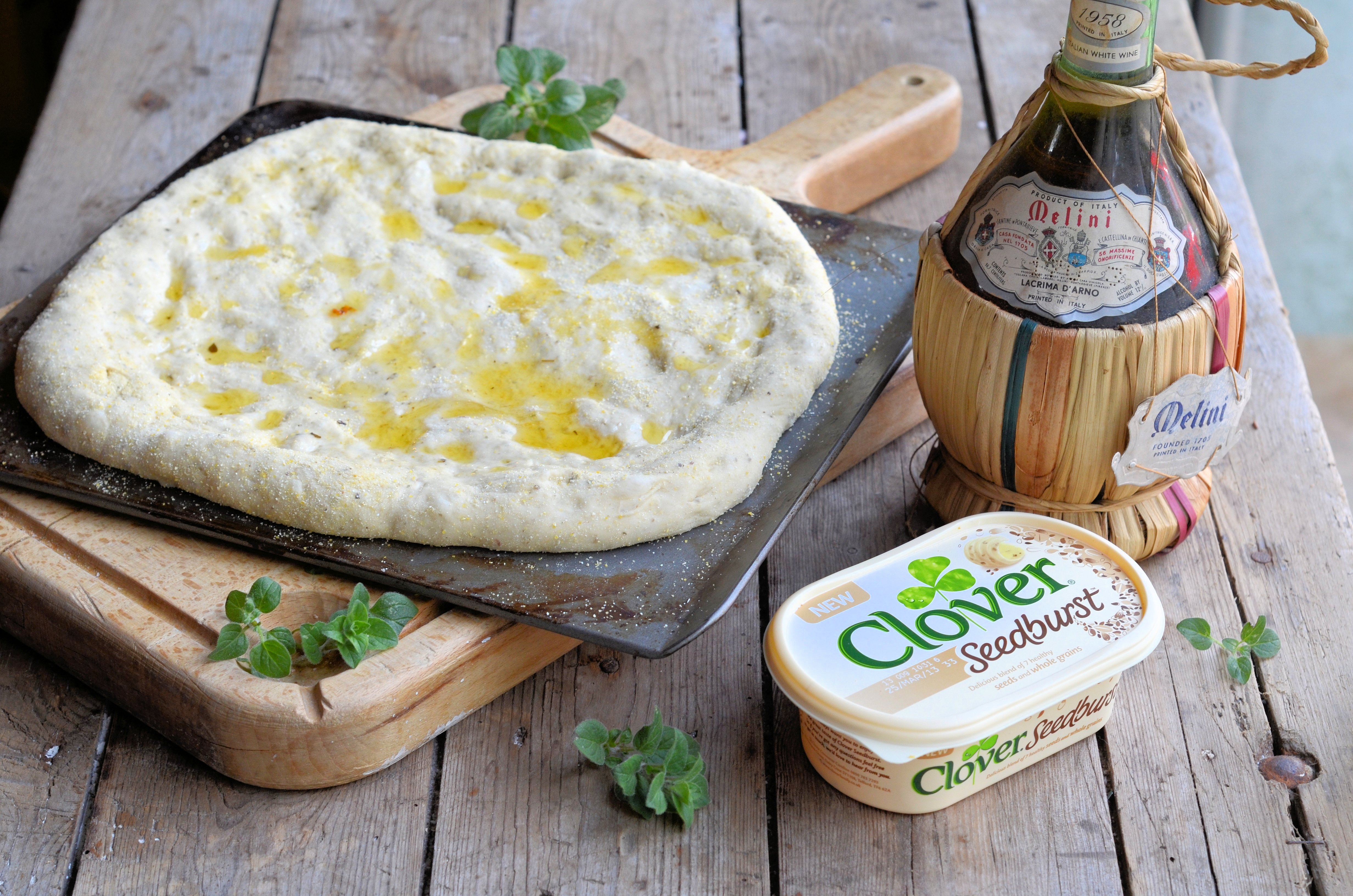| Step 1 | Mix the flour, salt, sugar, garlic granules, dried mixed herbs, oil, melted Clover Seedburst spread and yeast in a food processor fitted with a dough blade. Pour in the water and mix to a soft dough, then knead on low for 10 minutes. Remove the dough and roll out on a lightly floured surface (I use polenta or cornmeal in place of flour) to a round of about 30cm across. Lift on to an oiled baking sheet, sprinkle with the sun-dried tomato oil and allow to rise for 20 to 30 minutes. |