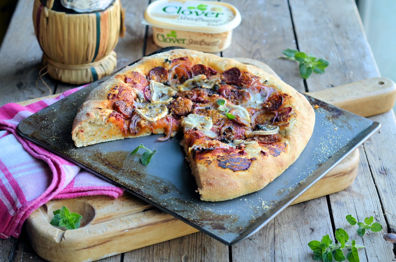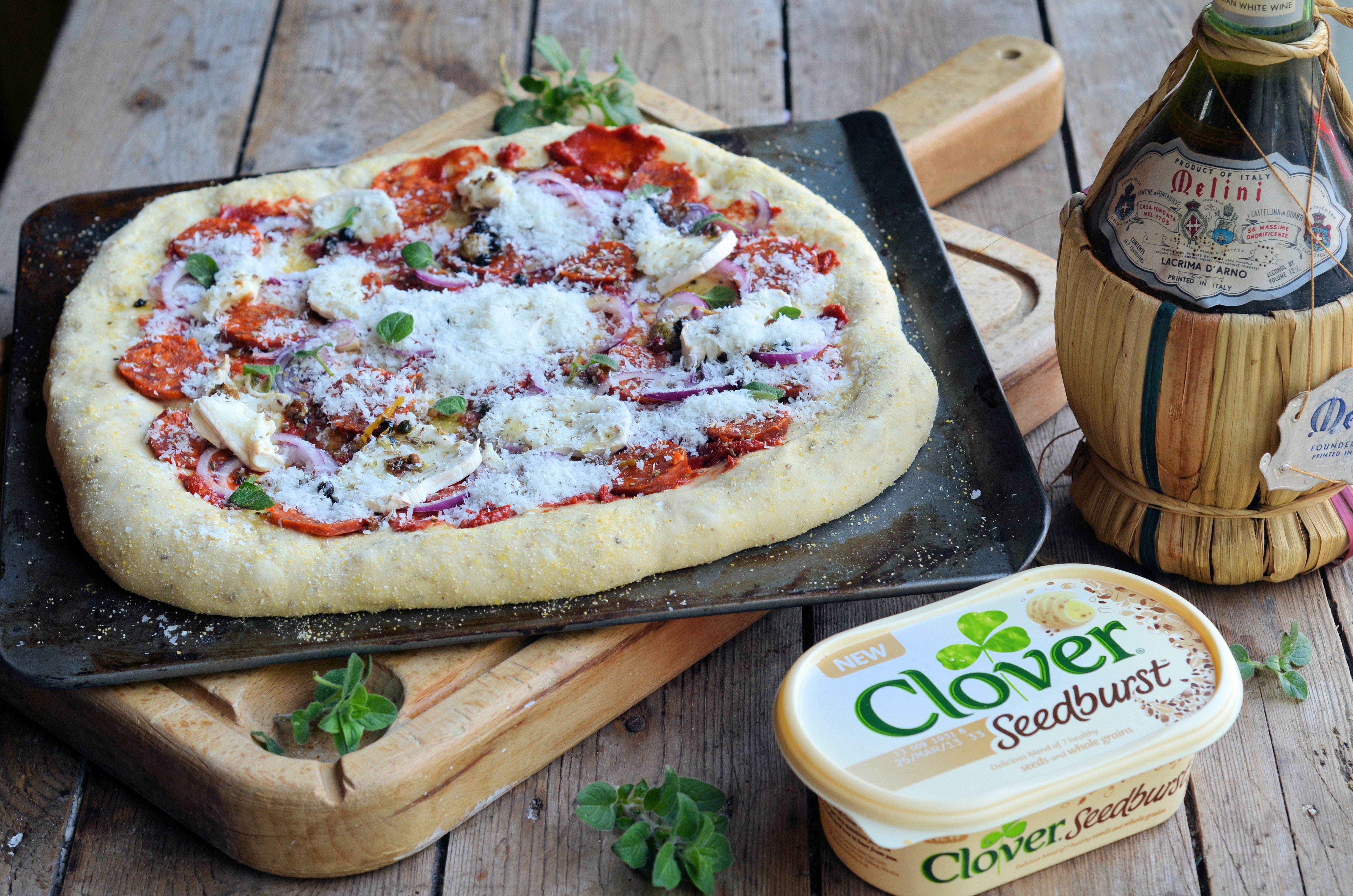 With winter returning to the landscape via shed loads of snow and cruel Easterly winds, my evenings have reverted to fireside suppers whilst watching the TV again…….mainly cooking programmes, much to my husband’s disgust! And, with these cosy evenings comes the desire for comfort food, so yesterday I decided to treat us to a take-away, but the home-made kind, so a large sharing pizza was made for fireside dining whilst watching the new series of Masterchef. My pizza is also part of a request from the lovely folks over at Clover to cook or bake with their latest product, Clover Seedburst; a delicious spread with a blend of seven healthy seeds and whole grains (Sesame, barley, linseeds, oats, wheat, rye and millet) that has 70% less saturated fat than butter. I have cooked with it before, you might remember me using it with my Sticky Ginger Marmalade Tea Loaf Recipe, as well as with my Smoked Cheese and Cherry Tomato Rarebit as well.