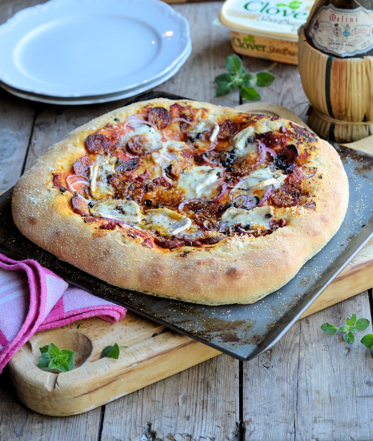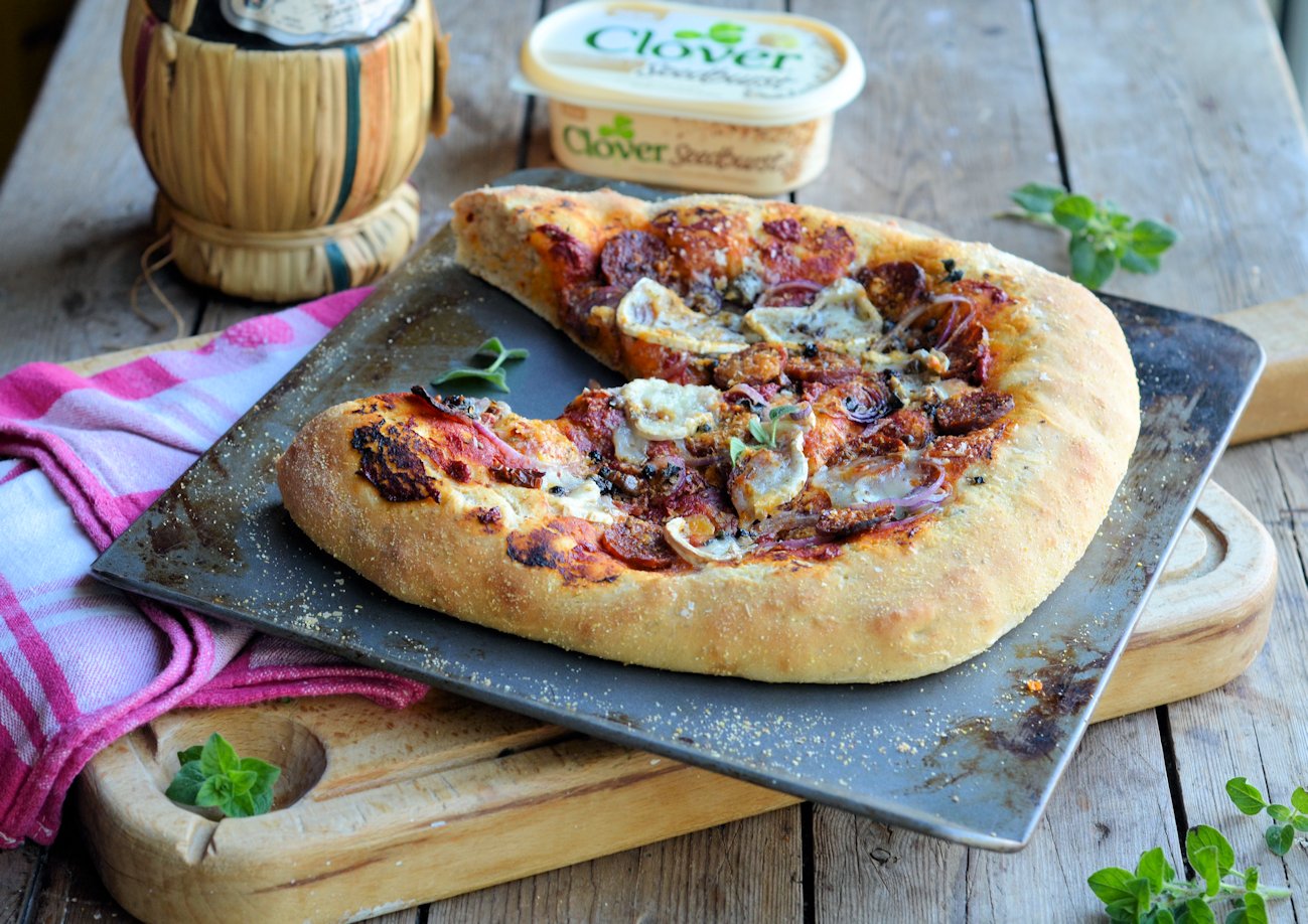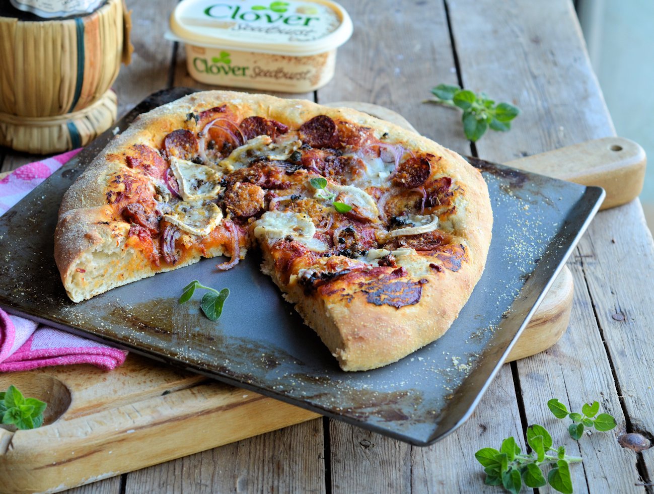 A lovely home-made garlic and herb pizza base with added seeds and grain (using Clover Seedburst spread), which is topped with spicy chorizo sausage, goat's cheese, red onions and Parmesan cheese. This recipe makes one large pizza, enough for 4 people, or two smaller pizzas to serve 2 people each. Perfect for the weekend or as a mid-week treat, and is lovely when served with a side salad.